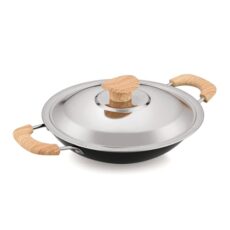 Bergner Bellini Plus Aura 5-Layer Non-Stick 20 cm Appachetty with Stainless Steel Lid, Wooden Finish Soft Touch Handle, Even Heat Distribution, PFOA Free, Gas Stove Compatible – Black