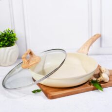 HomeEssentials Non Stick Maifan Stone Frying Pan – Fry Pan with Lid & Wooden Handle/Pre Seasoned 5 Layer Maifan Medical Stone Pan/All Gas & Induction Compatible/Chemical Coating Free,2.2 Litre