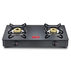 Prestige IRIS Toughened Glass-Top 2 Brass Burner LPG Gas Stove | Black | Spill Proof | Ergonomic Knobs | Tri-Pin Brass Burners