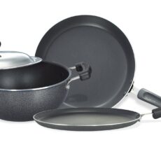 Prestige Omega Deluxe Granite Aluminium 3 Pcs Set- Tawa, Fry Pan & Kadai with 1 Glass Lid|Made Using German Technology|Non-Stick|Spatter-Coated Surface|Induction & Gas Compatible Base|Black