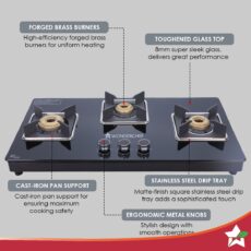 Octavia 3 Burner Glass Hob Top Auto Cooktop | 8mm Toughened Glass | Auto Ignition | Forged Brass Burners | Stainless Steel Drip Tray | Anti-Skid Legs | Large & Heavy Pan support | LPG compatible | Black steel frame | 2 Year Warranty | Black