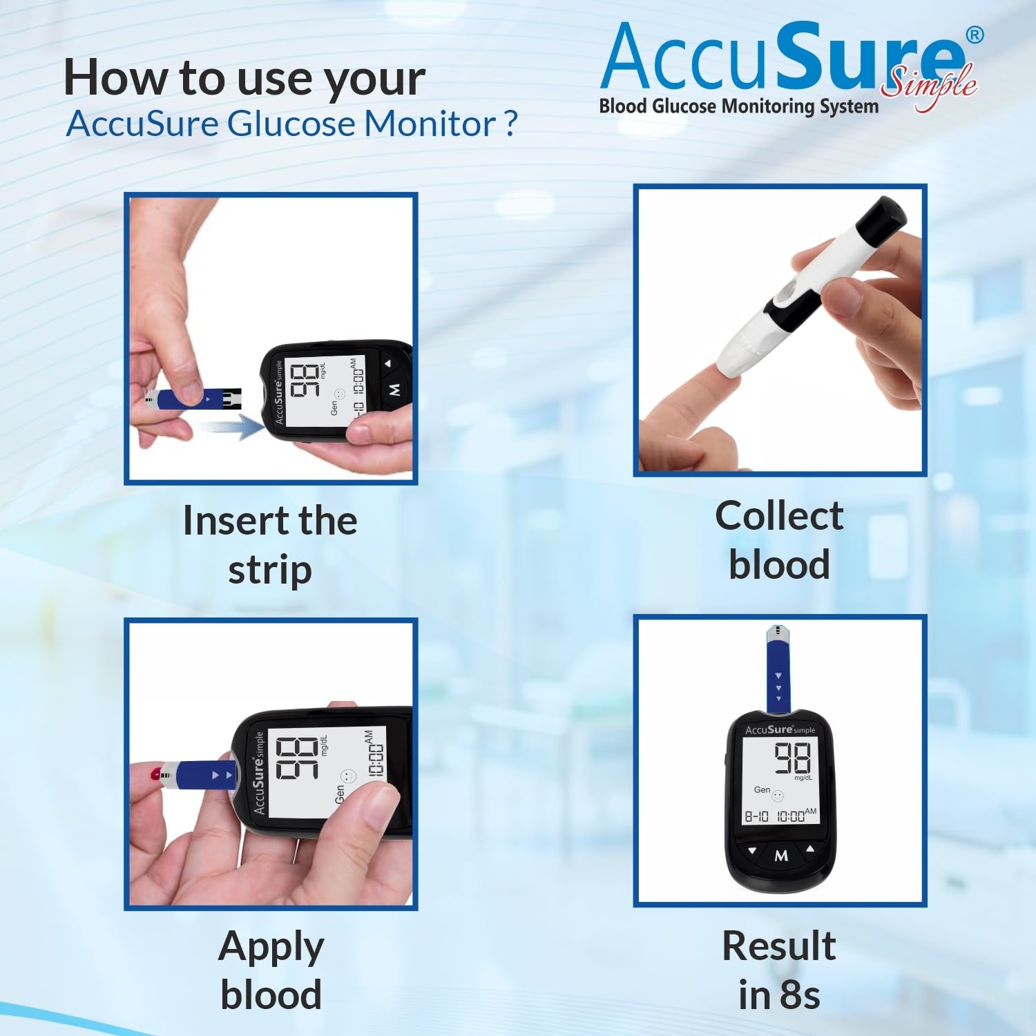 - AccuSure Simple Glucometer Set includes : Meter with battery , 25 Strips , 10 Lancets , 1 Lancing device & Carrying Pouch with User manual.