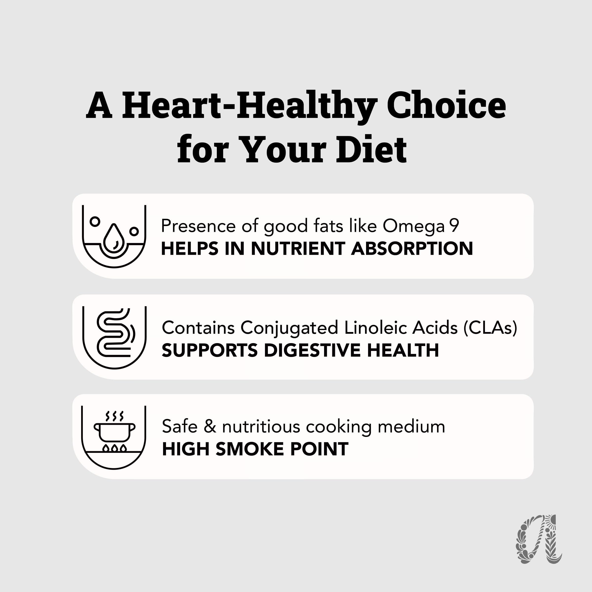 - SUPPORTS HEART HEALTH: Rich in healthy fats, buffalo ghee can help improve good cholesterol (HDL) levels when consumed in moderation, promoting heart health.