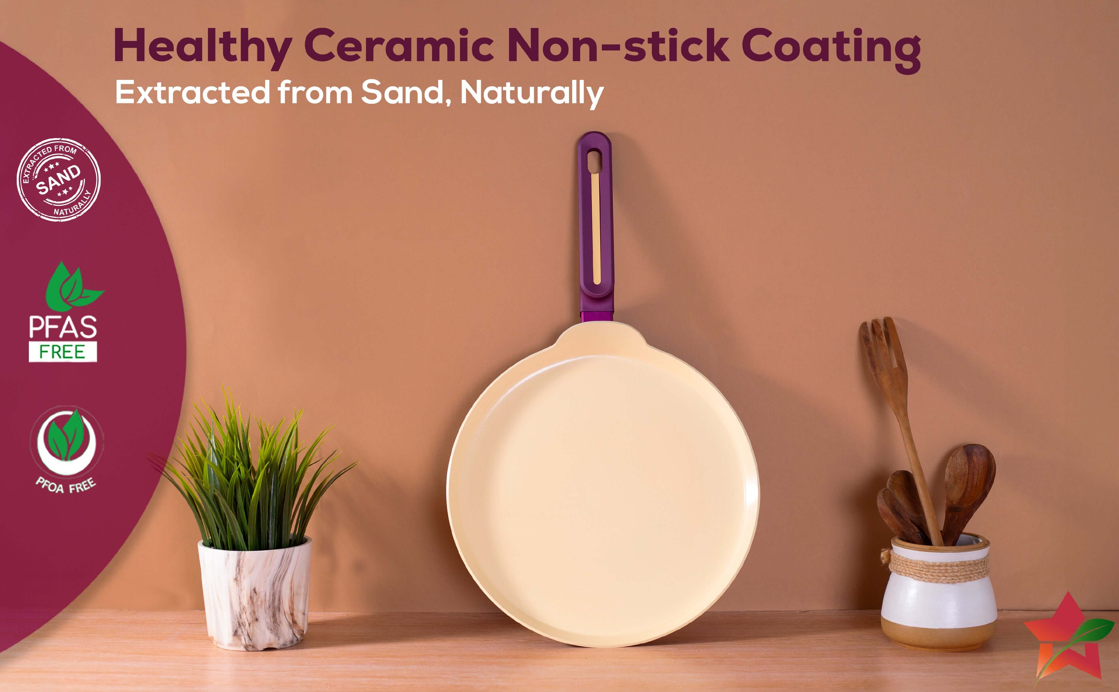 - The non-stick ceramic coating is made from ingredients naturally extracted from sand, which makes it safe for your loved ones, and good for the environment.