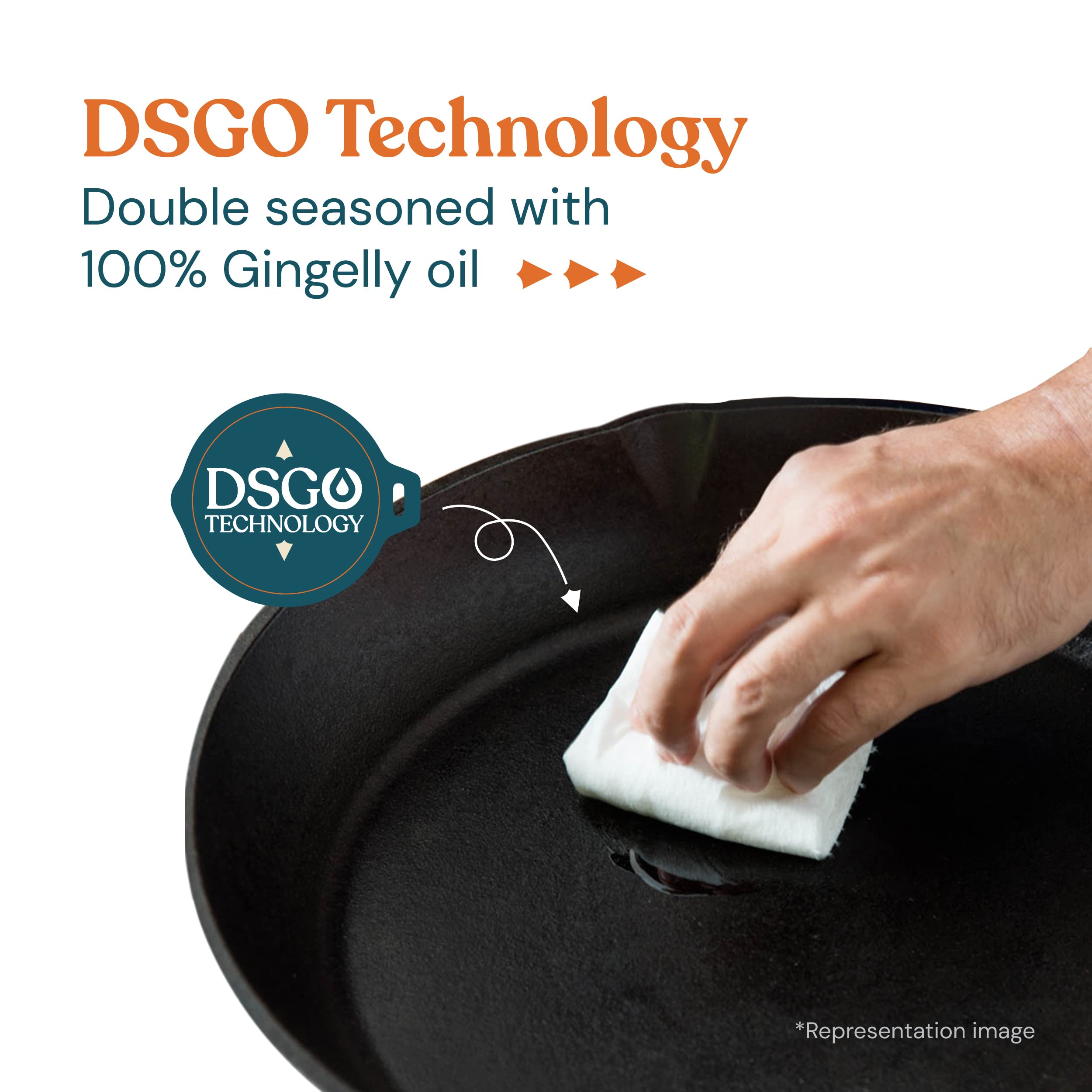 - 𝗗𝗦𝗚𝗢 𝗧𝗲𝗰𝗵𝗻𝗼𝗹𝗼𝗴𝘆: These cast iron cookware’s are Double Seasoned with Gingelly Oil (DSGO), which makes them ready to use. This seasoning with proper usage and care gets better with time.