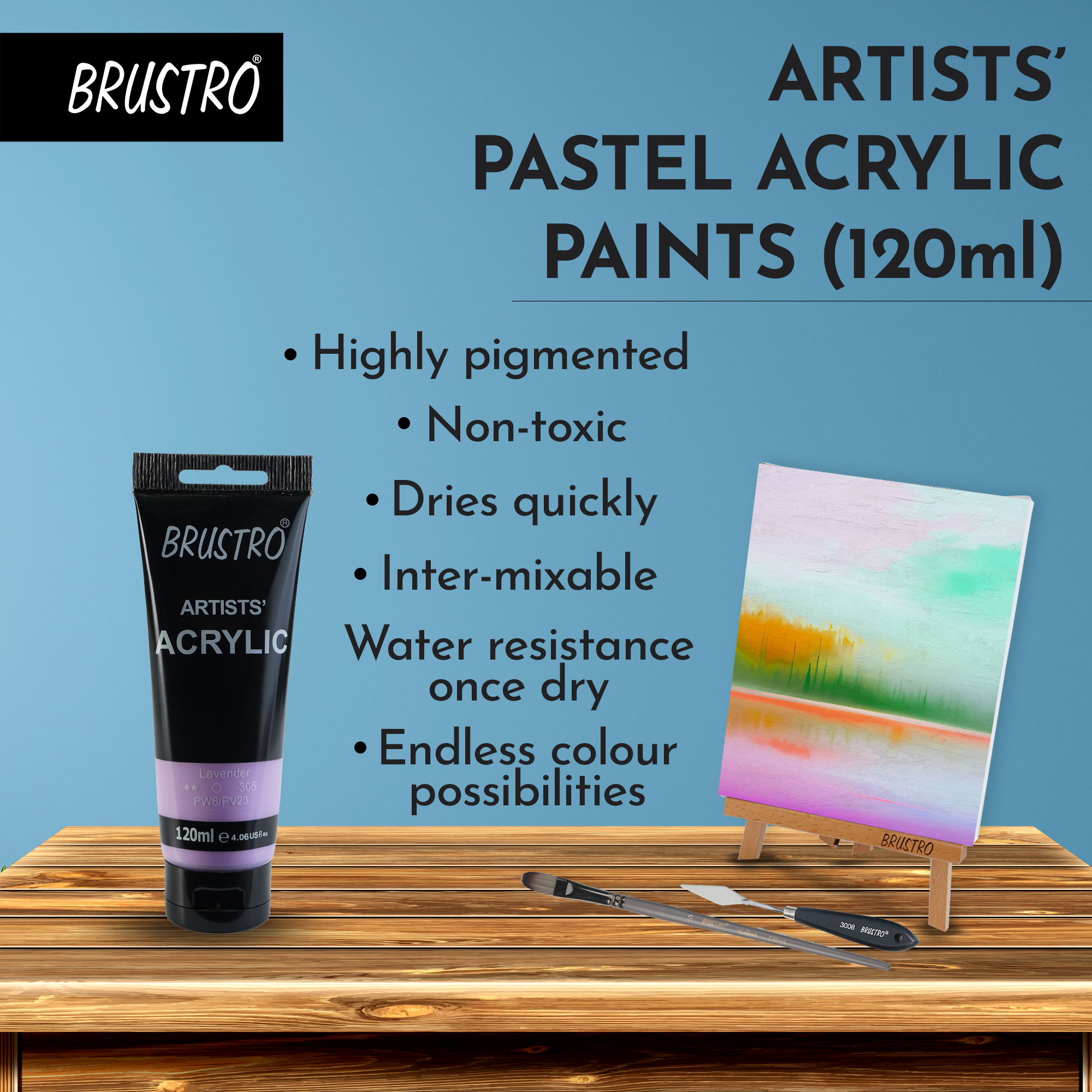 Brustro acrylics are affordable colours that can be used to paint on all conventional art surfaces such as paper, cardboard, canvasses etc. These soft bodied colours can be used straight from the tube as they wet easily on to the surface or they can be thinned with water. All the colours are inter-mixable giving endless colour possibilities. Best price quality ratio. These Acrylic Paints are perfect to create textured effects, brush marks and palette knife impressions.