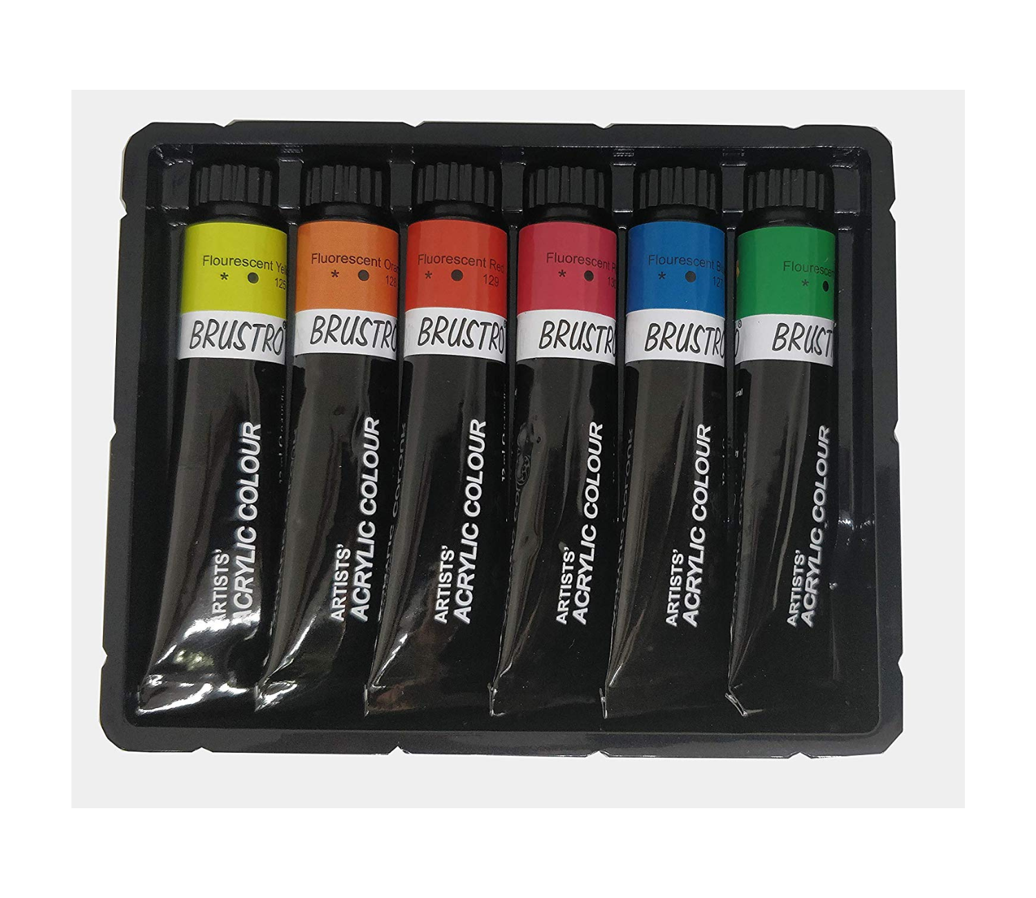 - Set of 6 fluorescent premium acrylic colour 12 ml tubes.Adheres to a great variety of surfaces like paper, canvas, wood and earthenware