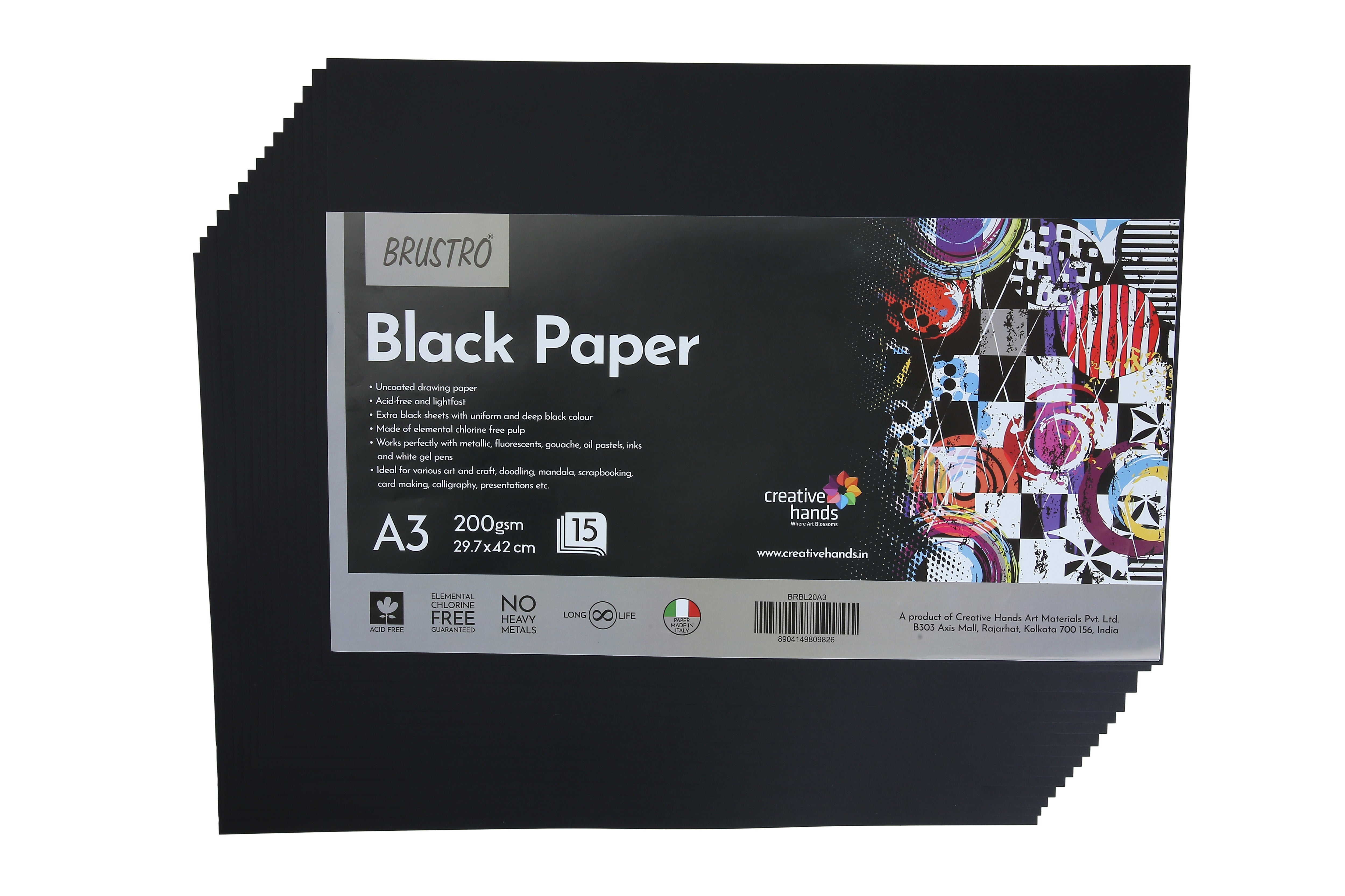 These Brustro Black Paper are Uncoated drawing paper. are Acid-free and lightfast black papers, Extra black sheets with uniform and deep black colour. Made of elemental chlorine free pulp. Works perfectly with metallic, fluorescents, gouache, oil pastels, inks and white gel pens. Ideal for various art and craft, doodling, mandala, scrapbooking, card making, calligraphy, presentations etc. Made in Italy.