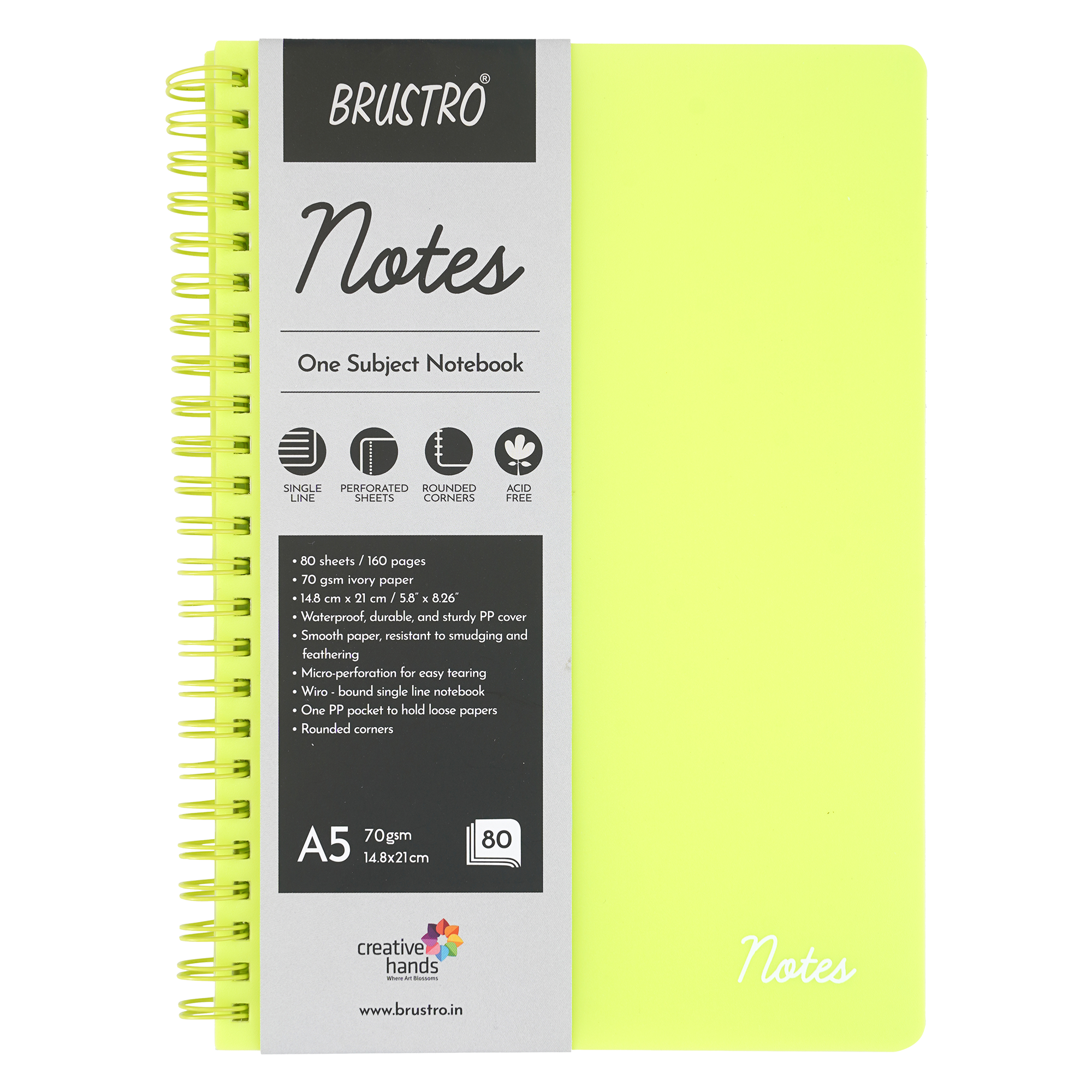 BRUSTRO Notes A5 Size, 1 Subject Ruled Notebook, 80 sheets / 160 pages, 70 gsm ivory paper, Lime Cover,