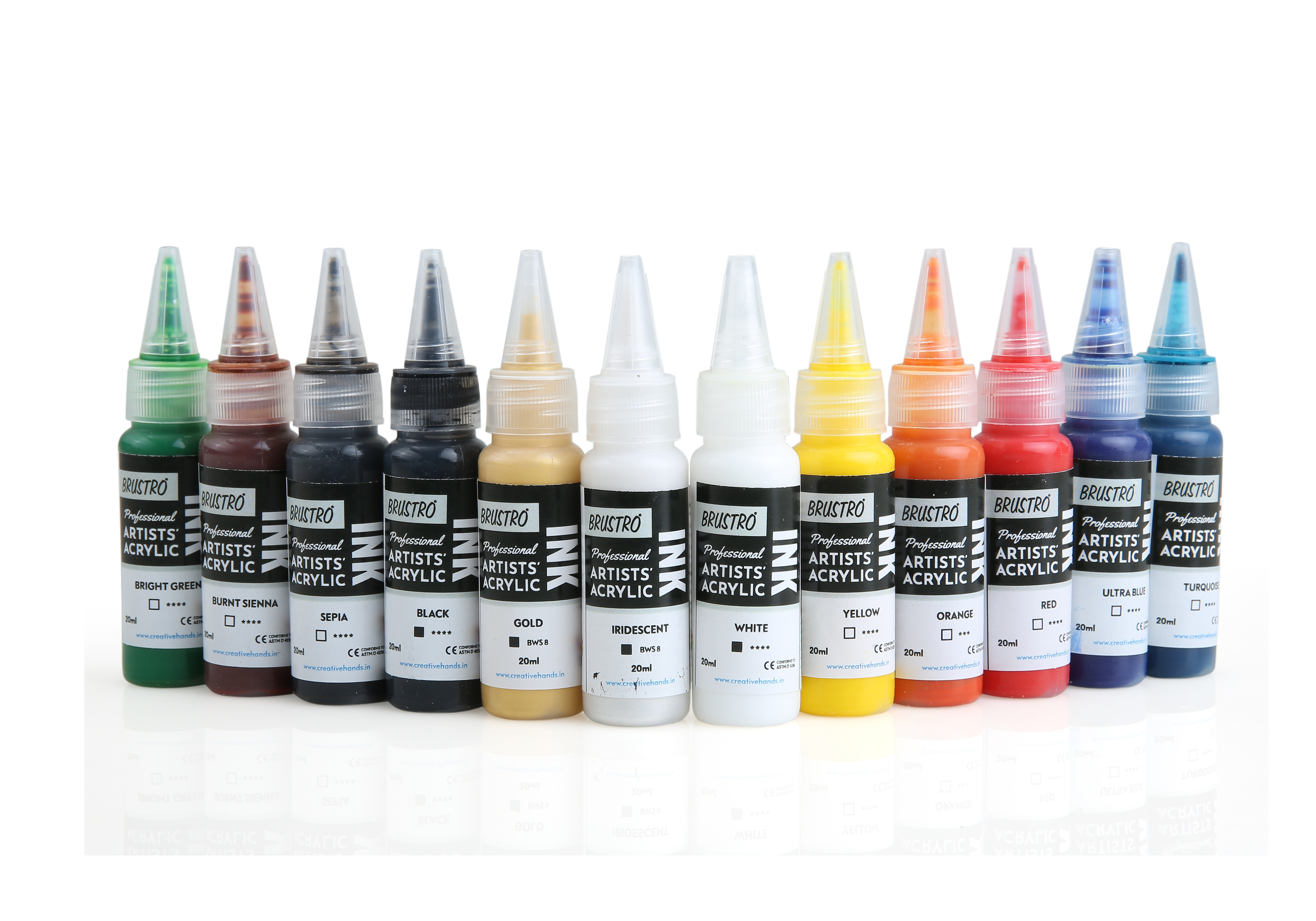 - They are perfectly compatible with all Brustro professional acrylics range for layering and mixing. Brustro Acrylic Inks should be shaken well before use as the fine pigment particles will separate over time from the binder. This is completely normal. Simply shake the bottle, Due to the nature of the metallic pigments in gold and iridescent, these inks will require more vigorous shaking. Shade names: White, Yellow, Orange, Red, Ultramarine Blue, Turquoise, Bright green, Burnt Sienna, Sepia, Black, Gold, Iridescent.