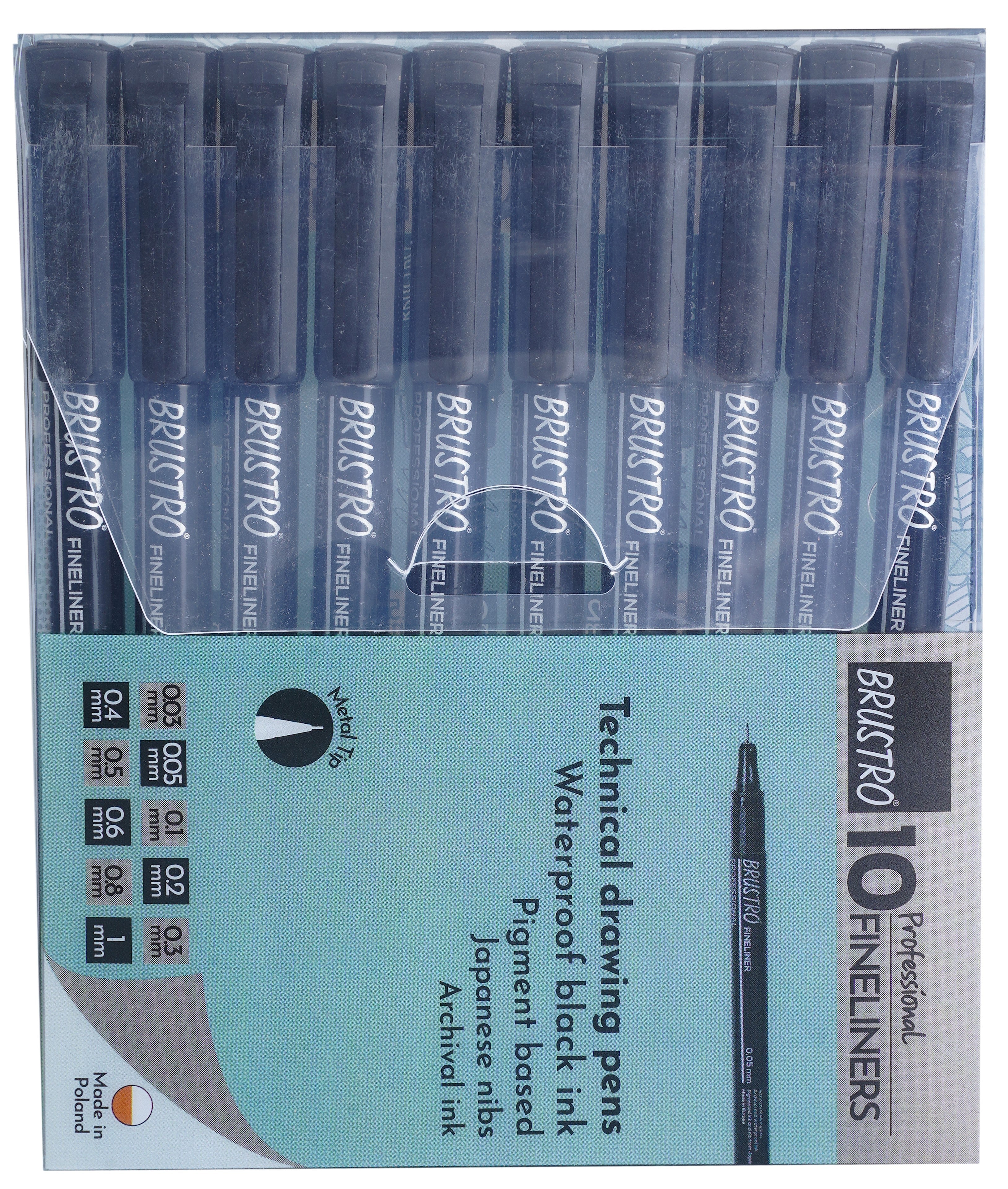 This set contains 10 fineliners which include: 0.03/0.05/0.1/0.2/0.3/0,4/0.5/0.6/0.8/1 mm (in black ink).