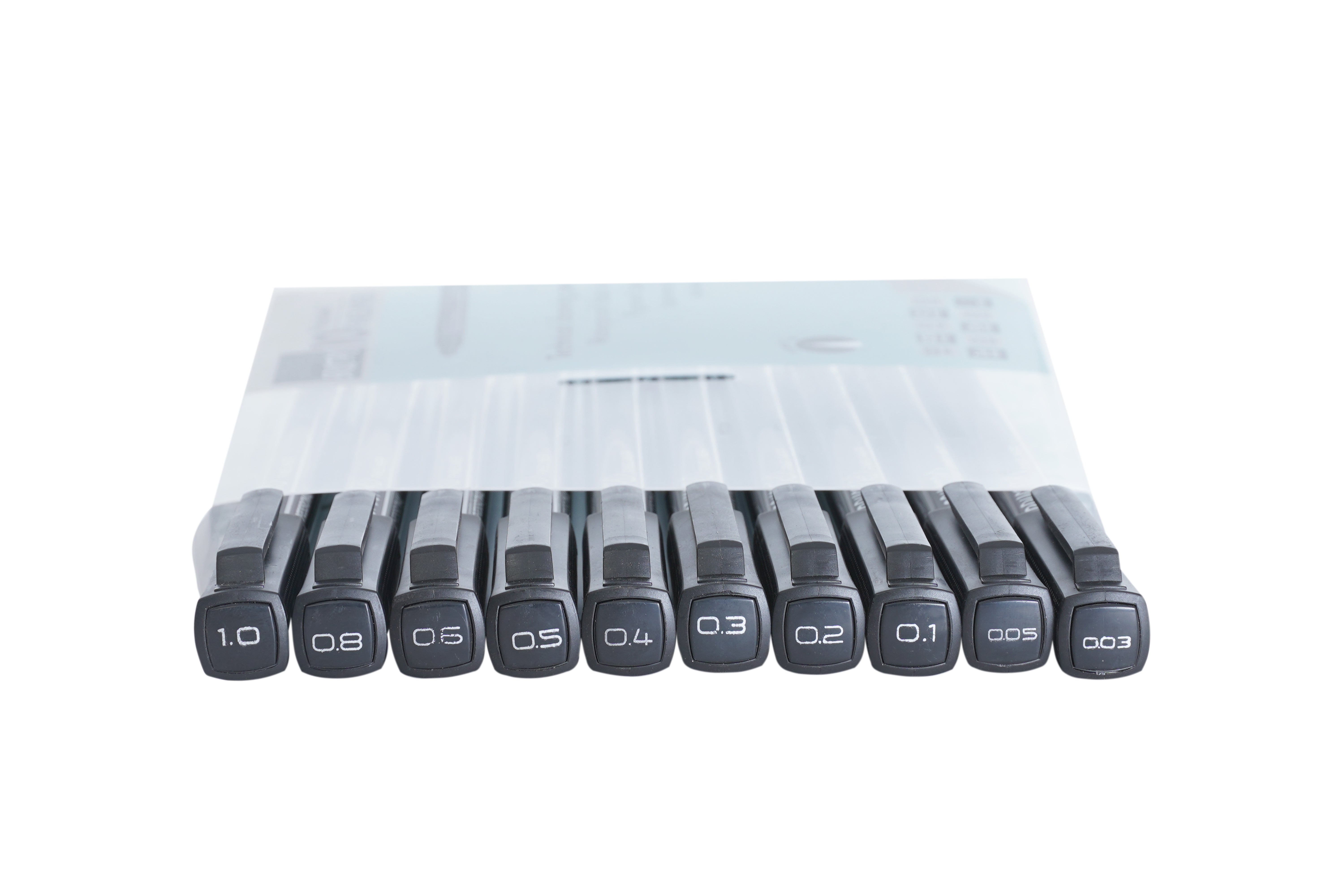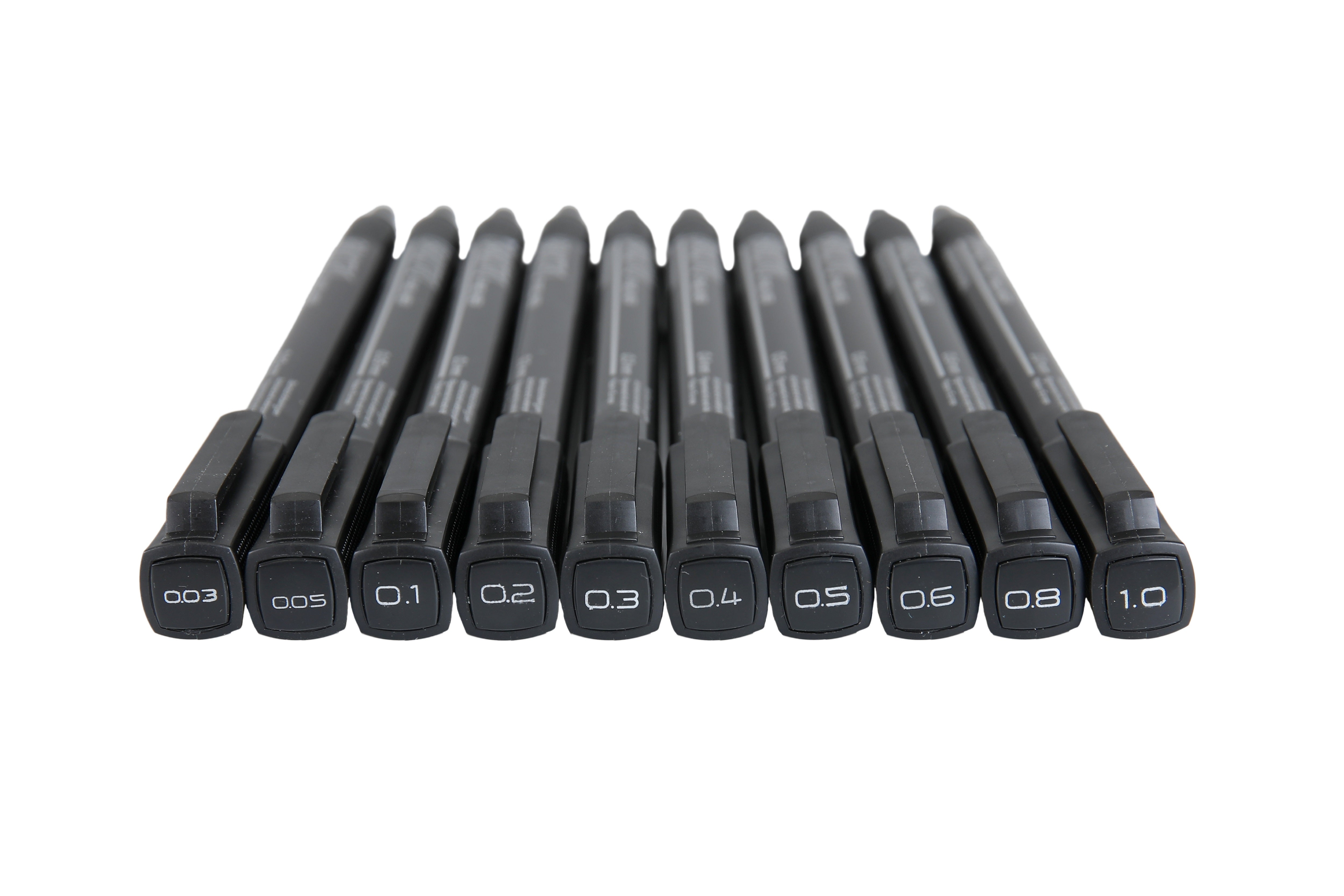 - This set contains 10 fineliners which include: 0.03/0.05/0.1/0.2/0.3/0,4/0.5/0.6/0.8/1 mm (in black ink) .