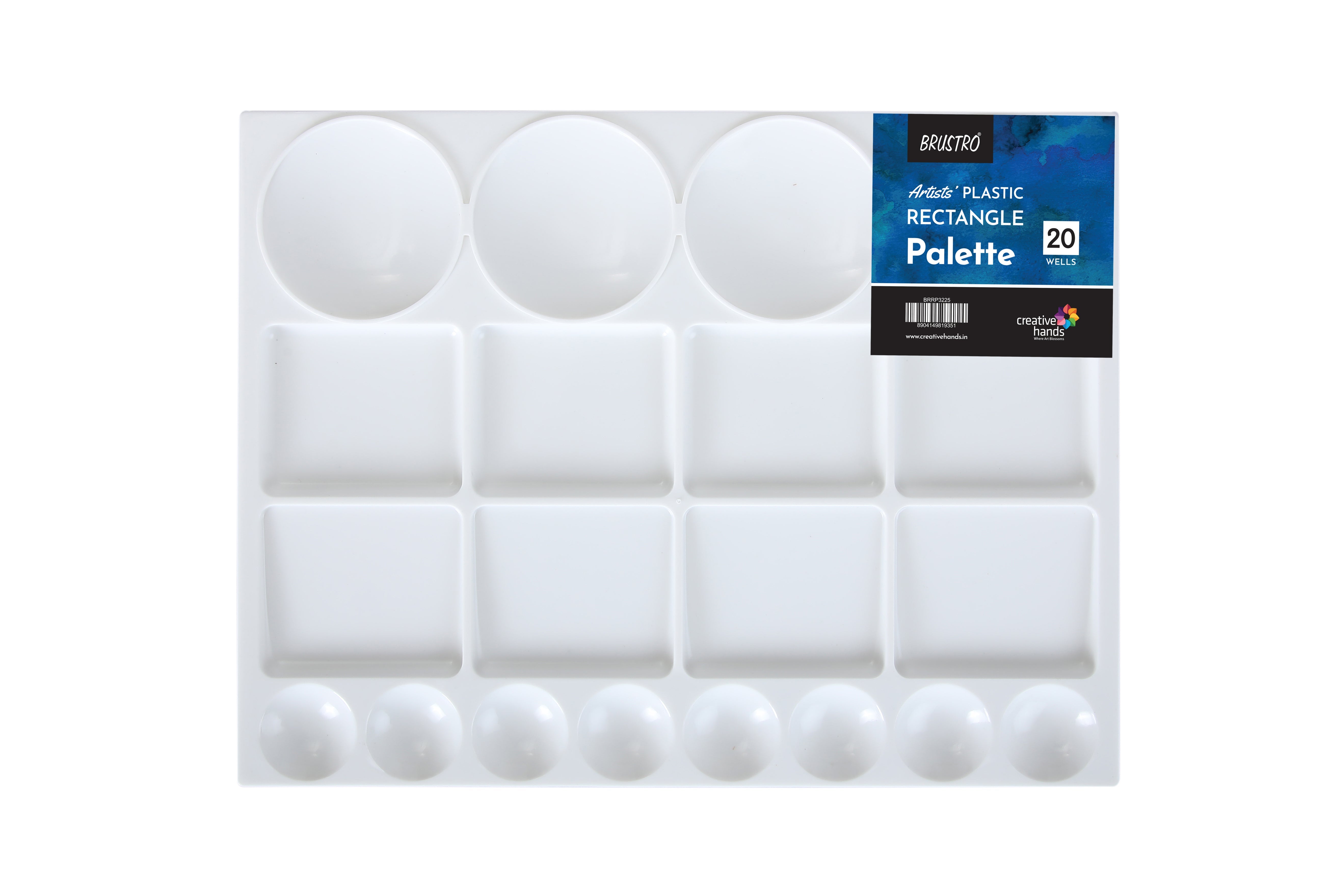 This heavy duty Rectangle Plastic Palette has 20-well tray features both large and small mixing wells (8 small round wells, 4 large round wells and 8 square wells), with rounded edges that will not harm brushes. Measuring a generous 32.5CMX25CM, the Brustro Rectangle Shaped 20 wells Palette.