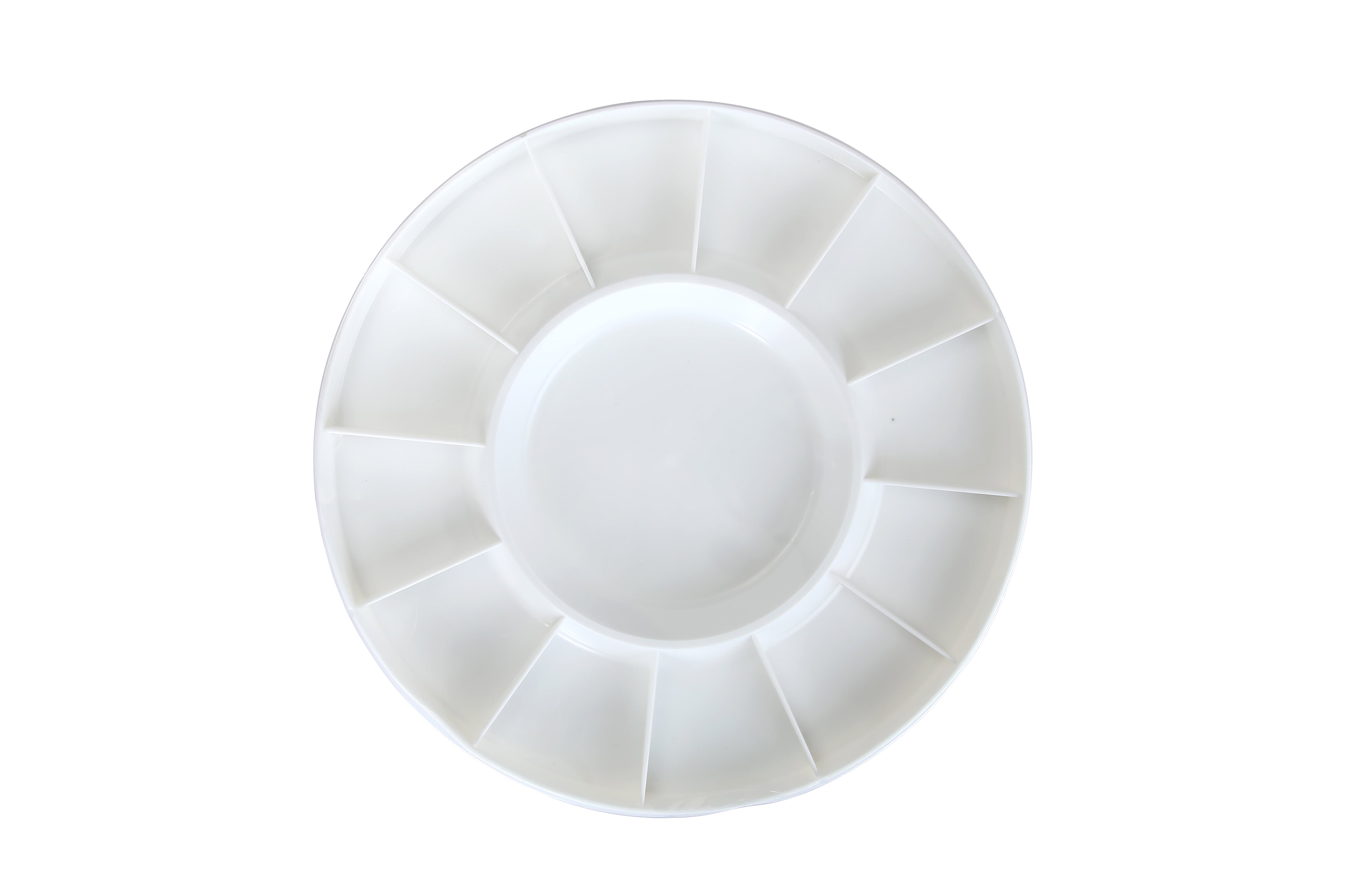 - Circular plastic palette with 12 uniform wells and a central large mixing area.