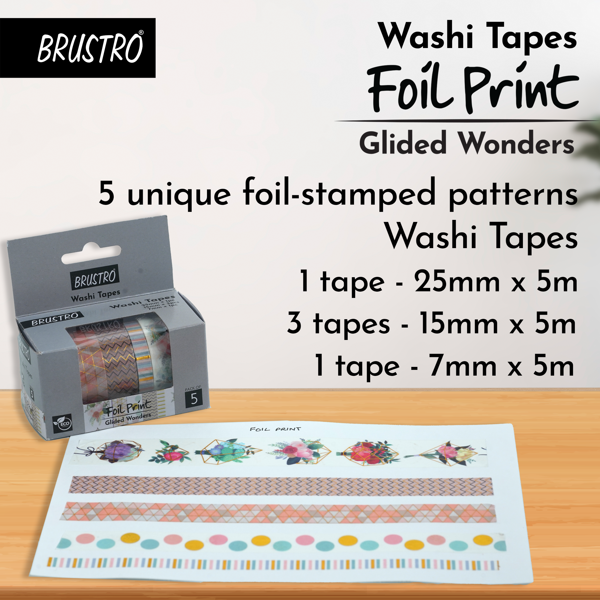 - Eco friendly masking tapes. Easily tearable by hand. Foil Prints Shade , 25 mm x 5m – 1 Tape , 15 mm x 5m – 3 Tapes , 7mm x 5m – 1 Tape (set of 5)
