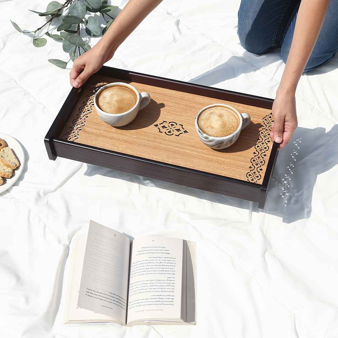 The ergonomically designed cut-out handles provide the tray with a comfortable grip. The designed glass top is easy to clean and is ideal to be used at home or office, etc. The intricate laser cut design brings elegance to your table along with the polish that gives the tray a shiny and clear look. Impress your guests by presenting your tea or coffee, your favorite varieties of cheese and bread, or any delightful treats on our classy and elegant wooden tray.