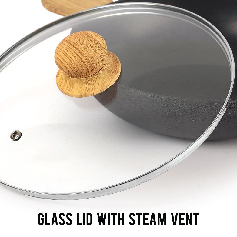 - Glass Lid with Wooden Knob: The Kadhai includes glass lids with knobs. These lids are transparent, allowing you to monitor the cooking process without lifting them, which helps to retain heat and moisture. The knob on the lid provides a secure grip for easy handling.