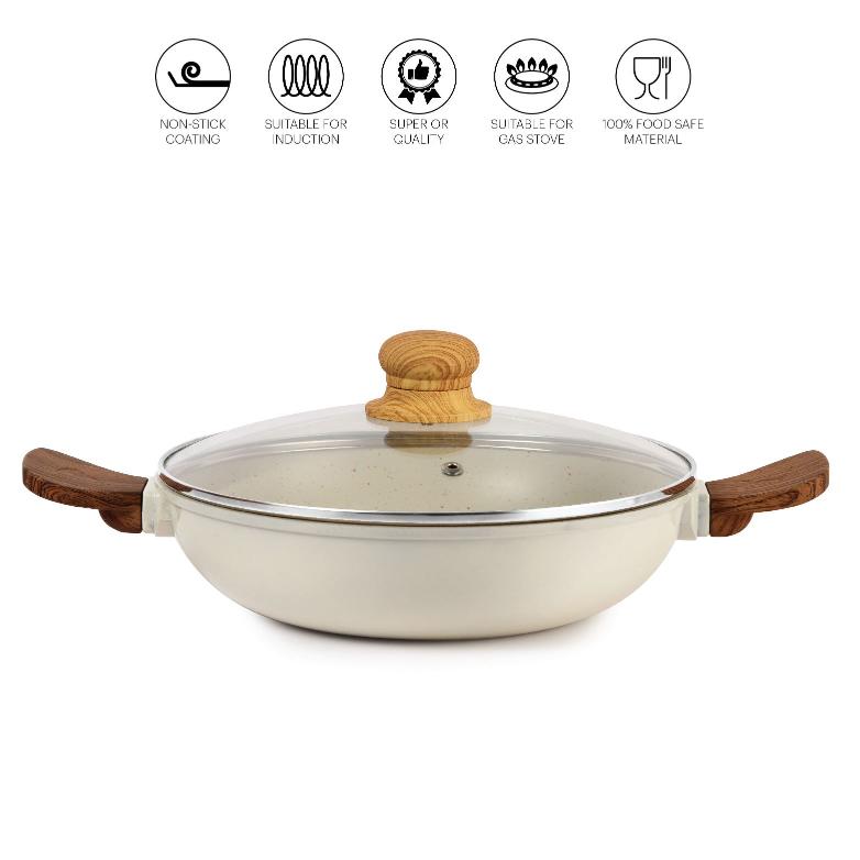 - Non-stick Coating- Cello’s Castello Die Cast cookware Aluminium Kadhai features a durable 4-layer nonstick coating, 4 mm Thickness, which ensures easy food release and minimizes the need for excessive oil or butter during cooking. This coating is made from food-grade materials, providing a safe and healthy cooking surface.