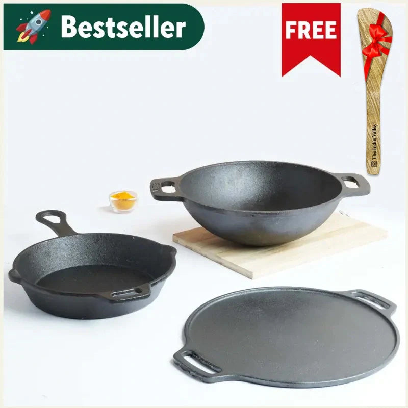 CASTrong Cast Iron Cookware Set: Free ₹110 Spatula +Tawa+Kadai+Fry Pan, Kitchen set for Home, Pre-seasoned,100% Pure,Toxin-free
