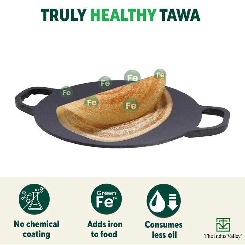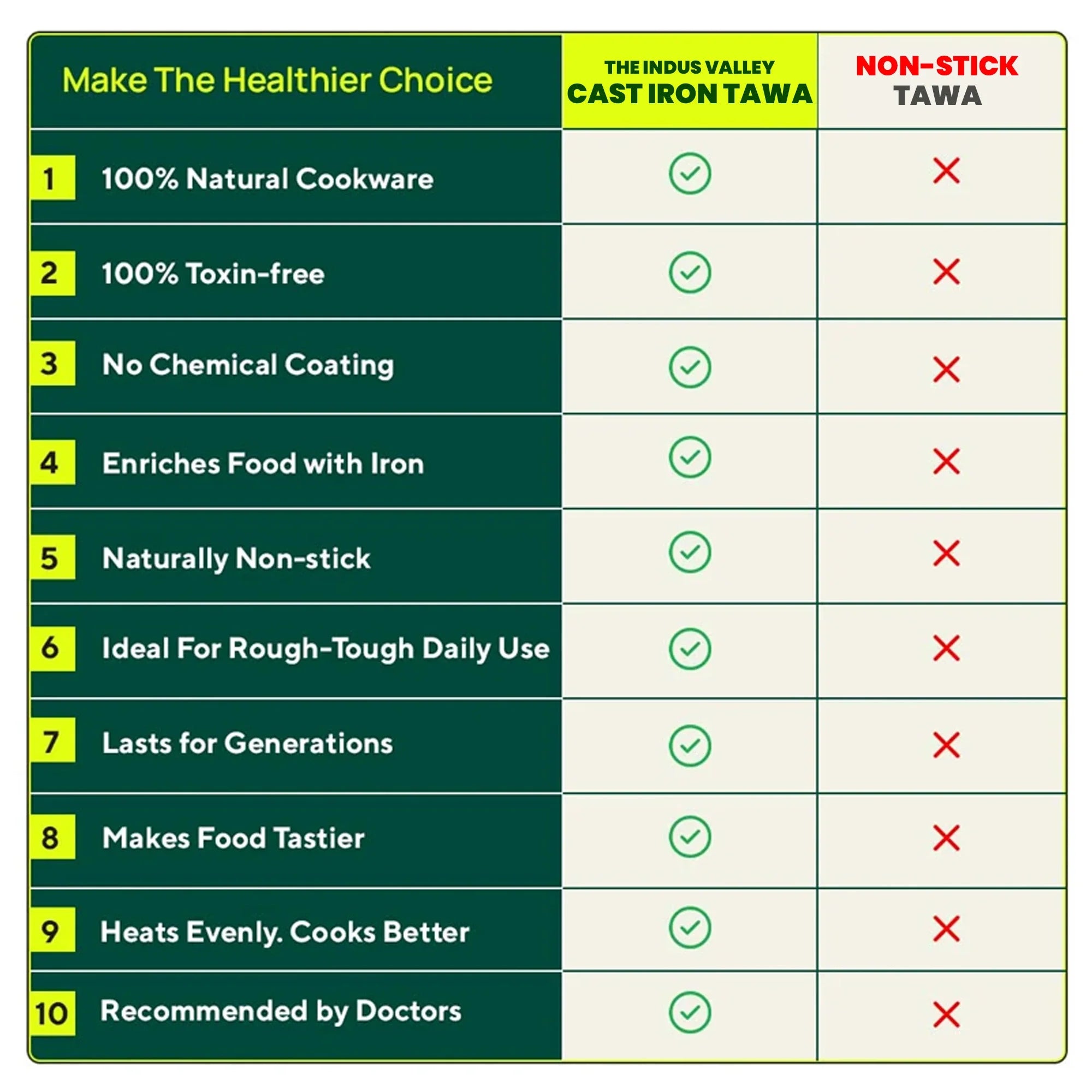 🌿100% NATURAL & TOXIN-FREE: The Indus Valley Premium Cast Iron Concave Tawa is made of 100% natural material that’s food-safe. No chemical coating. So, it’s a healthier alternative and the best roti tawa choice when compared to non-stick tawa.