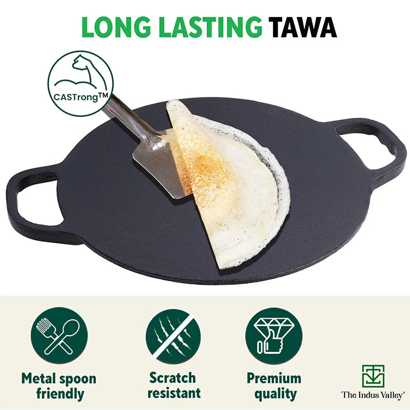 👌MULTI-PURPOSE COOKWARE: This cast iron tawa works well on the gas stove, OTG and campfire. Trust cast iron cookware to give you a superior performance. This pre seasoned cast iron tawa consistently gives you the best cooking results.