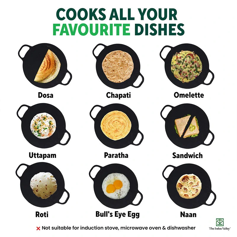 🍳COOKS ALL YOUR FAVOURITE DISHES: The concave surface ensures you get fluffy soft rotis. Besides using it as cast iron tawa for roti, you can also make uttapam, chapathi, paratha, omelette and more in it.