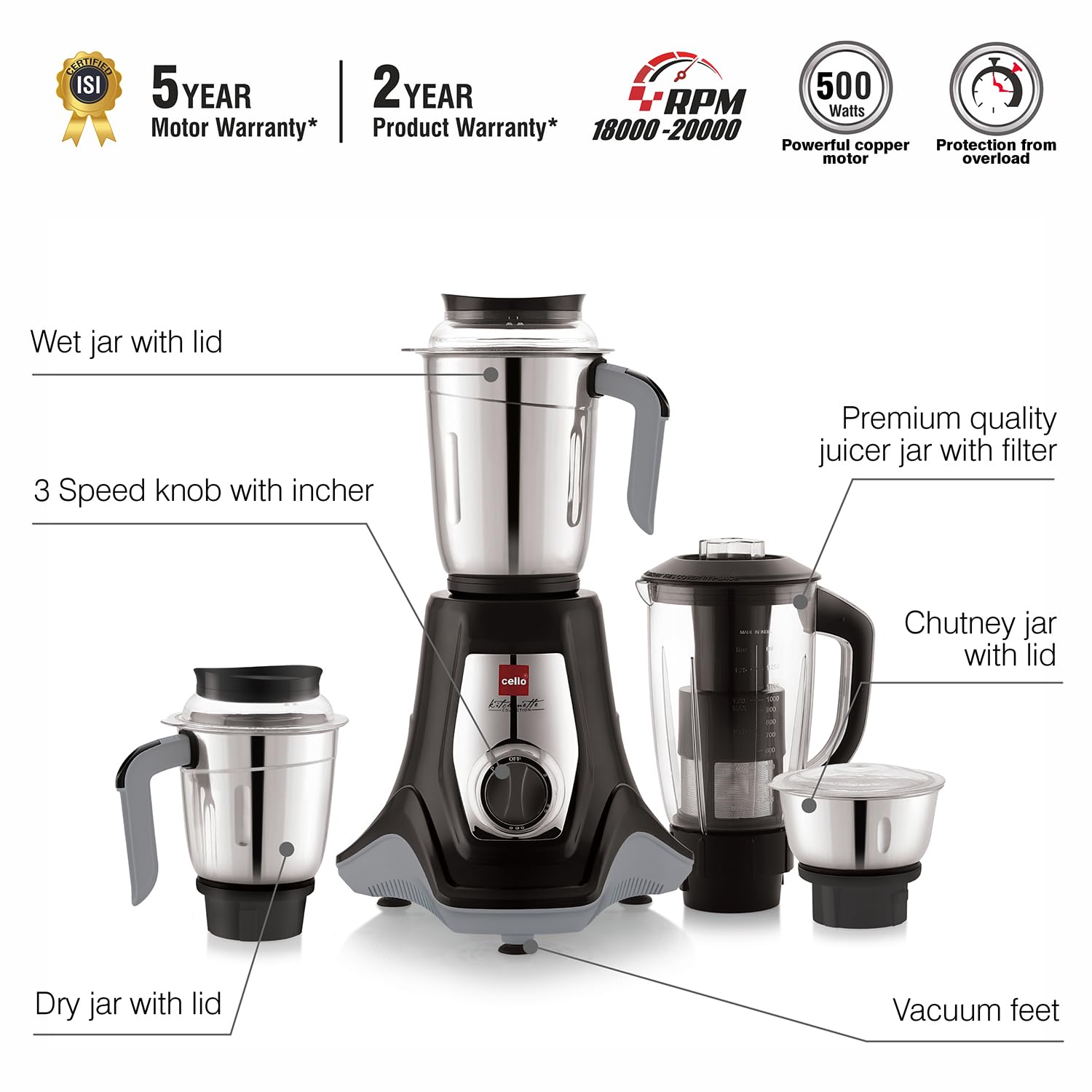 - Powerful 500W Motor with 3-Speed Knob: The Levante Pro Plus Mixer Grinder is equipped with a strong 500W motor and a convenient 3-speed knob, providing optimal power and control for efficient grinding and blending.