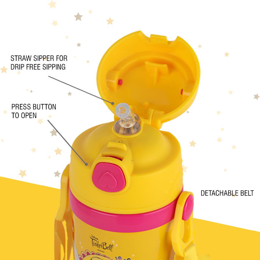 Introducing the Champ 400 water bottle by Cello Kidzbee, perfect for kids who are always on the go! With a 400ml capacity and cool designs like Tinker Bell and Spiderman, it’s both fun and functional. Available in Yellow, Red, Blue, and Sky Blue, it’s easy to match your style. The push-button straw sipper and adjustable neck strap make it easy to use and carry. Plus, the double-wall vacuum insulation keeps drinks cool on hot days. Its wide cap and flip top ensure a leak-proof seal, even when on its side. Stay hydrated, cool, and stylish with the Champ 400 water bottle!