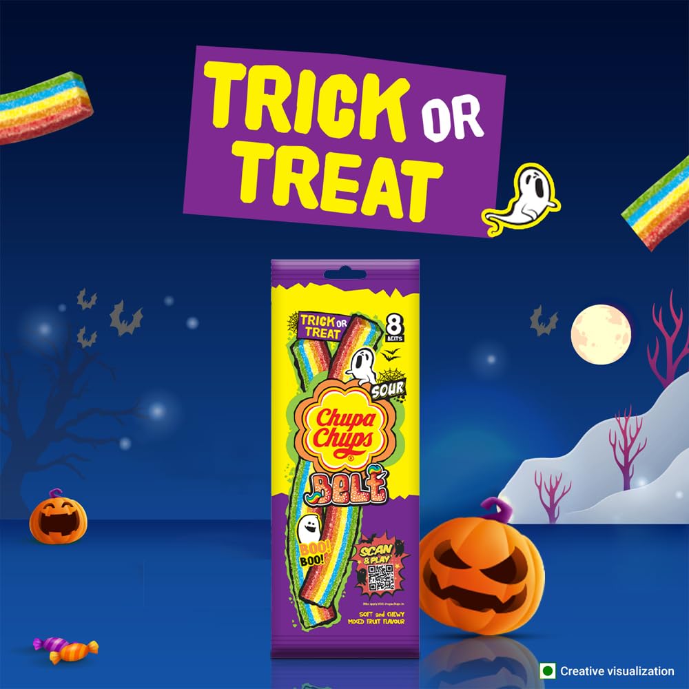 Details: Chupa Chups Sour Belts – Take Fun Seriously Chupa Chups – one of the most popular candy brands in over 150 countries is now in India with its latest offering, Sour Belts. These are attractive multi-coloured chewy sour belts which come in exciting mixed fruit flavour. Want to have a sweet toffee or a sour candy? Why not have both? Chupa Chups Sour Belts have been designed to give sweet and sour indulgence at the same time. These are soft and chewy candies that are fun to eat. Containing 8 pieces, each individual pack is great to share with friends for some serious fun! What else? These Belts come with fine sugar-dusting on top that provides additional sensation and long lasting experience