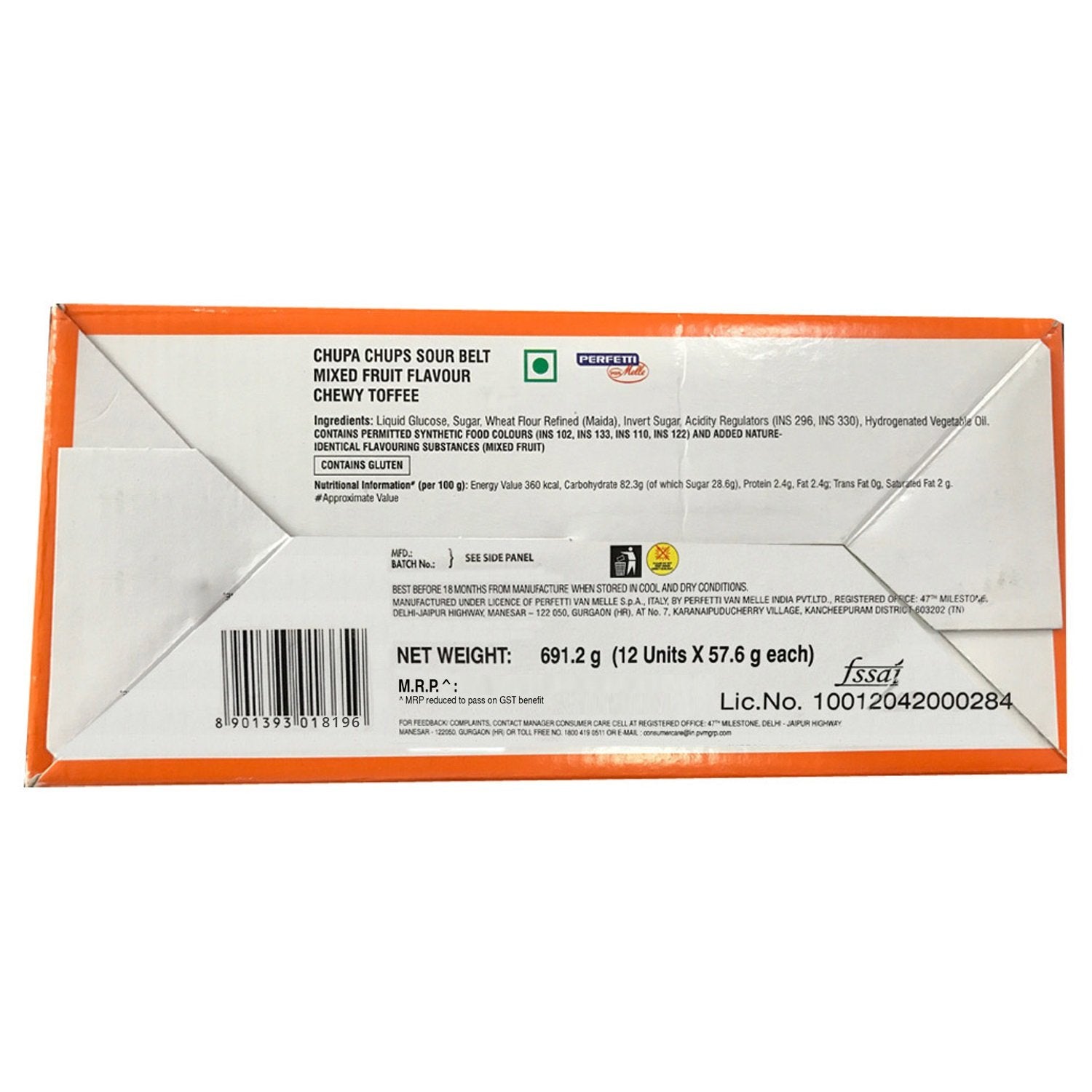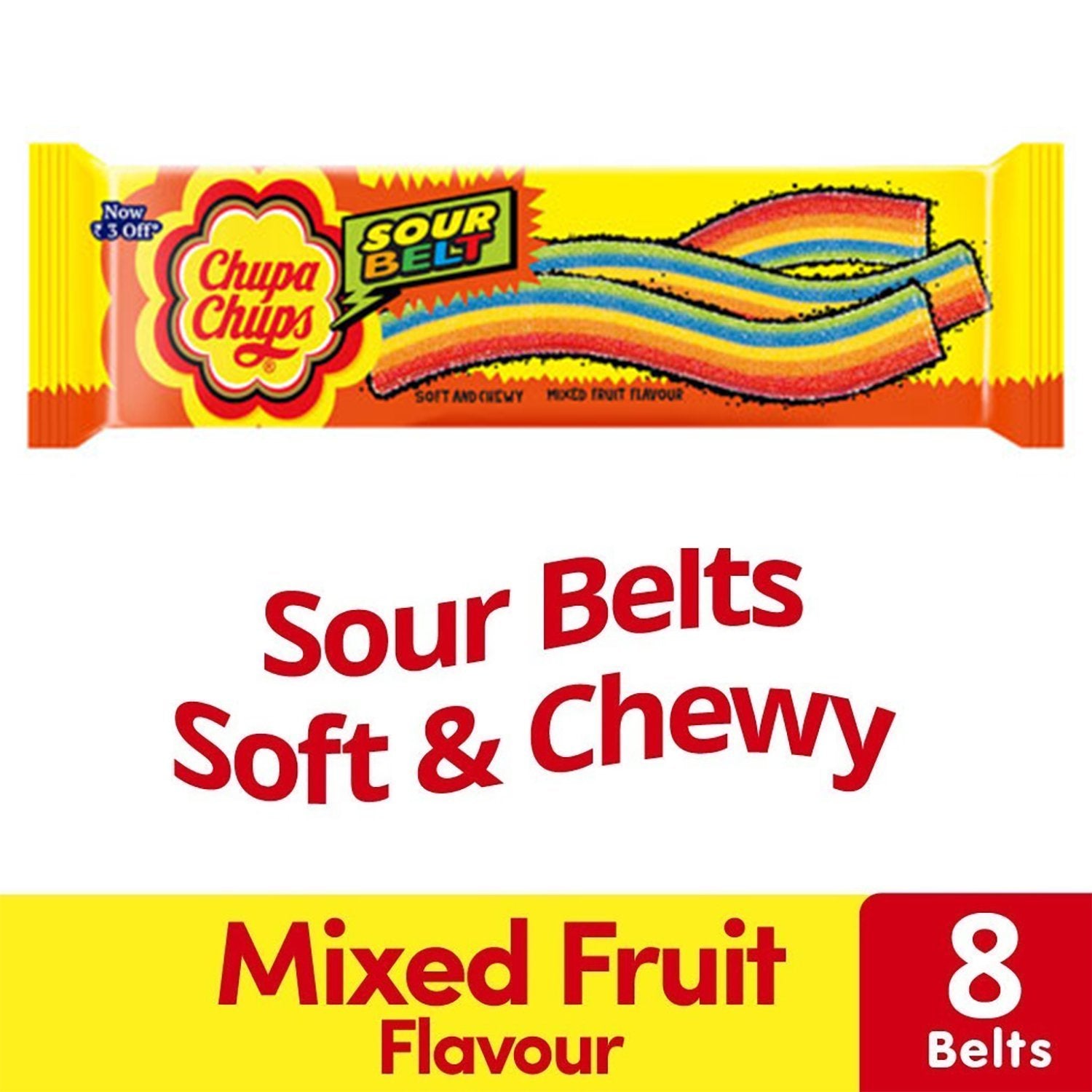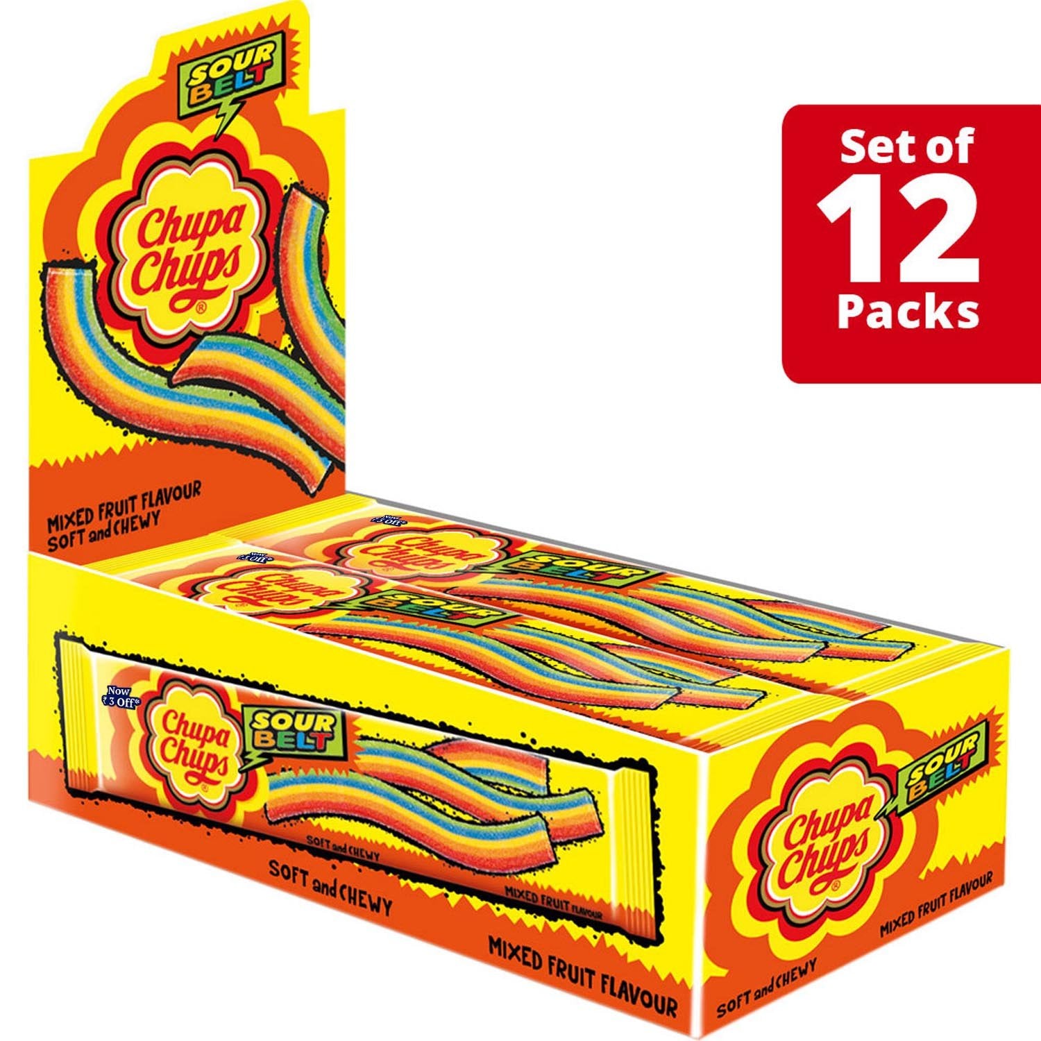 Details: Ready for some serious fun with your friends? Hurry! Grab a pack of 12 Chupa Chups Sour Belts, Chewy Toffee, 8 belts in each pack. Multicolored belt shaped product available in mixed fruit flavor. The tray pack makes it very convenient to store & share. A great pack to share and have some serious fun! This Product is 100% Vegetarian
