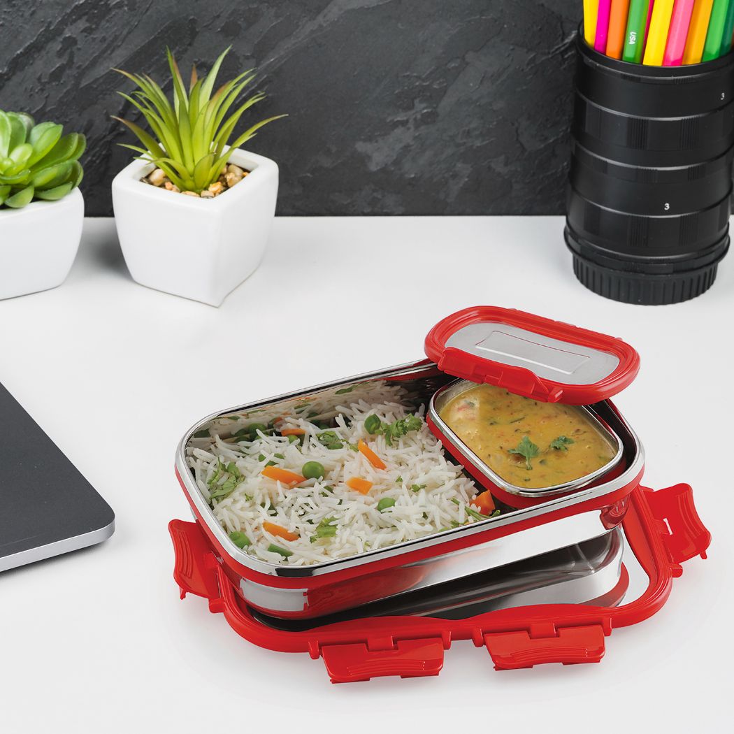 Introducing the Click It Stainless Steel Lunch Box in a generous Big size, offering a practical and international concept in meal storage. These stainless steel lunch boxes are designed to maintain the freshness of your food for extended periods while ensuring hygiene and safety. With airtight seals and food-grade silicon seals in the lids, your meals remain moist and flavorful.