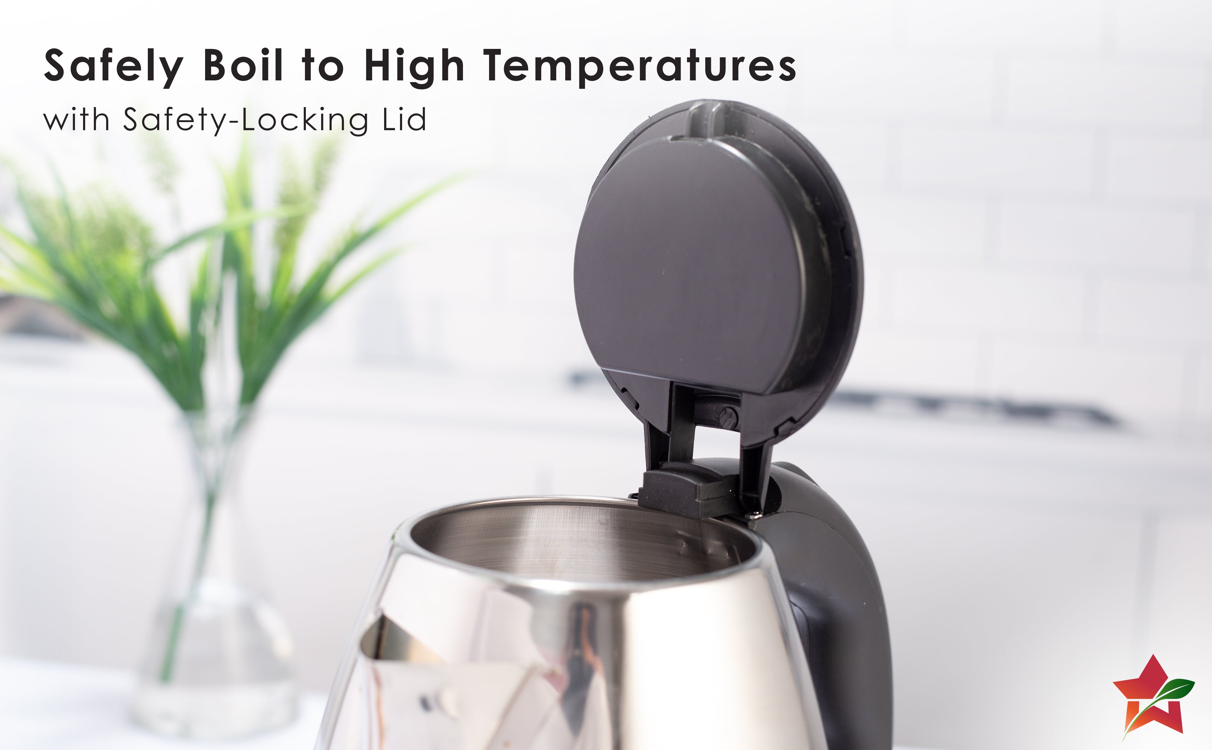 - Crescent Electric Kettle has a safety locking lid to ensure liquid doesn’t drip