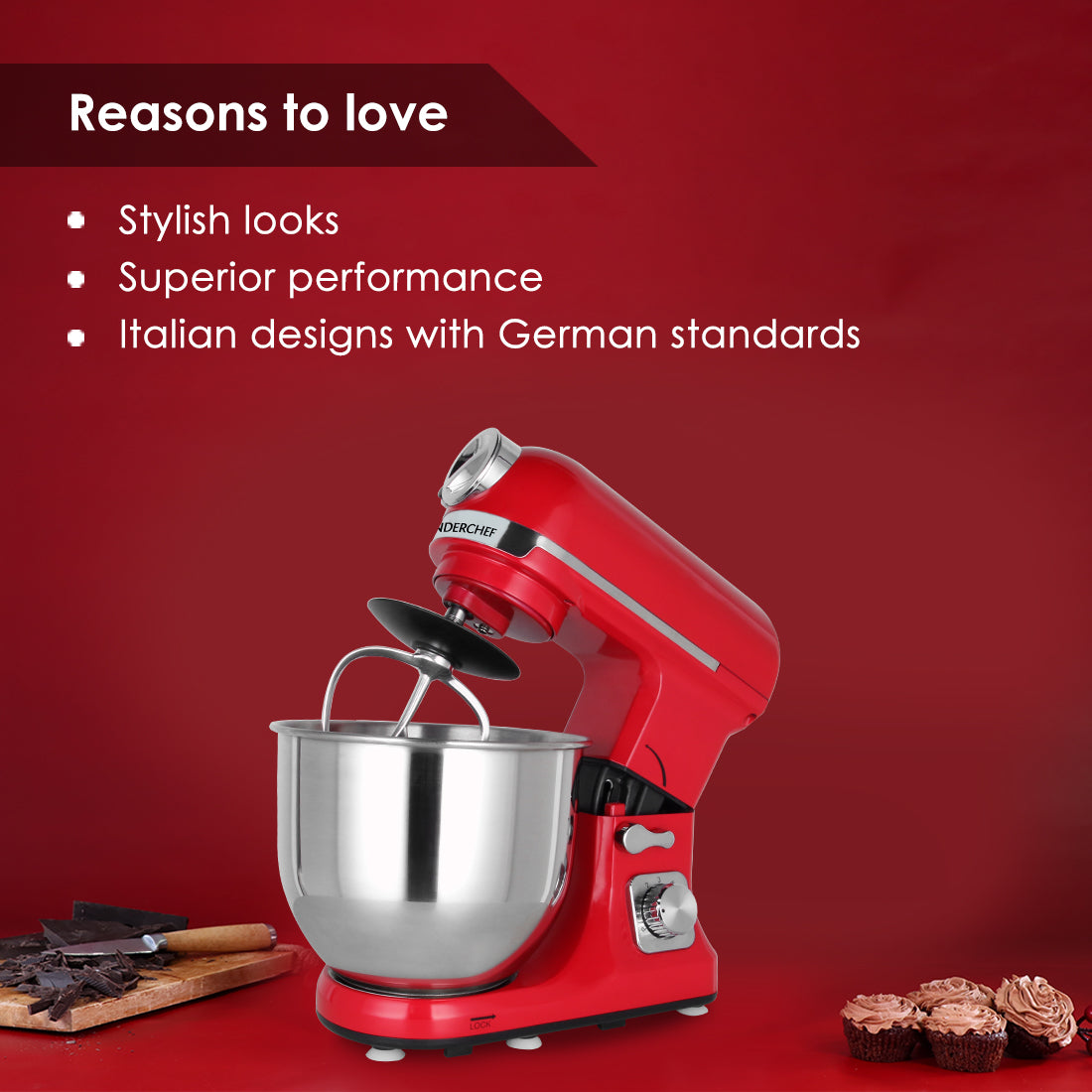 Crimson Edge Stand Mixer is ideal for making doughs for pizzas, rotis, breads and whipping up lip-smacking mixes for cakes and pastries. It comes with 3 types of beaters for mixing, whisking and dough making. The detachable aluminum-alloy blades ensure easy cleaning. Prep with ease using this well designed stand mixer