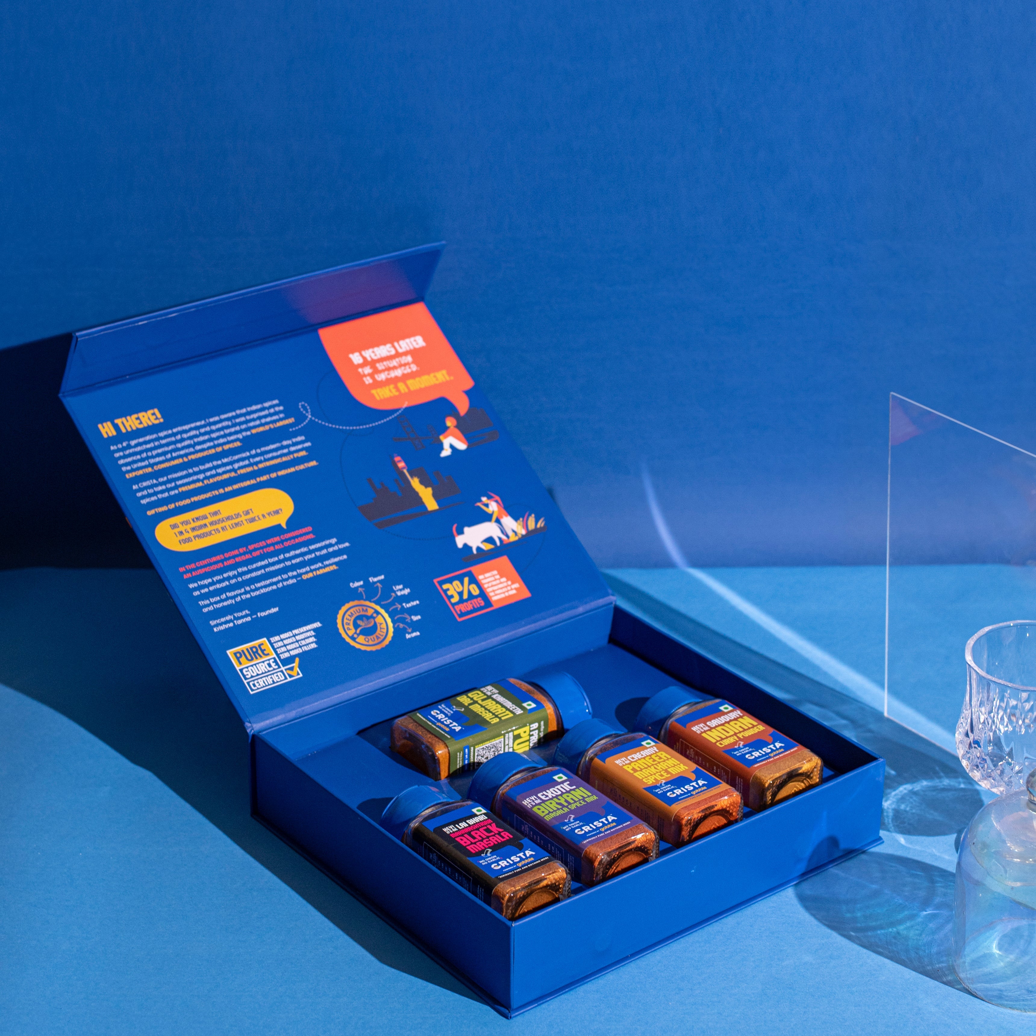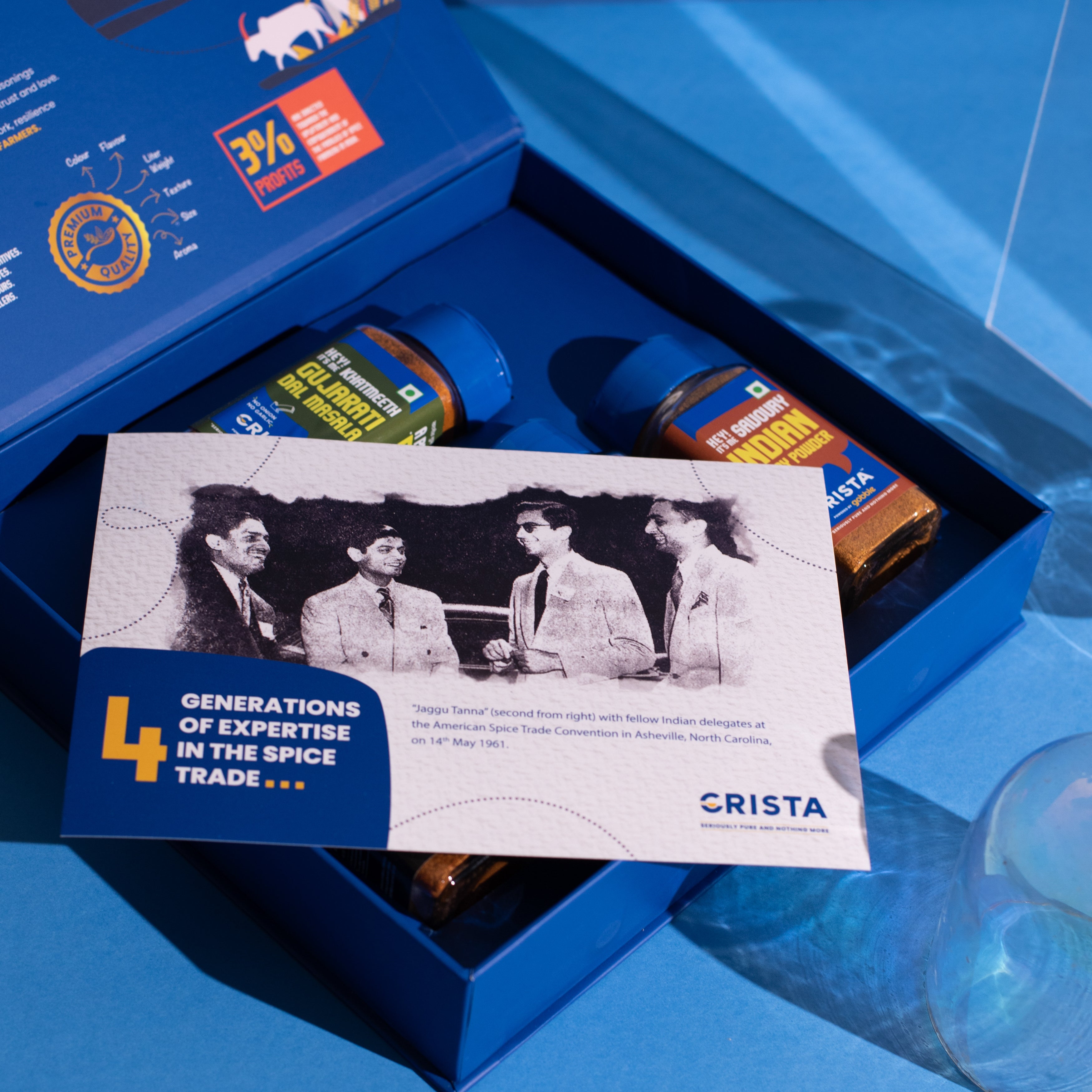 CRISTA Seasonings Gift Boxes are a series of six unique and modern theme oriented gift boxes that consist of a variety of natural, authentic and flavourful Indian and International Seasonings. Baby Showers, Birth Annoucements, Birthdays, Anniversaries, Housewarmings and Festive Occasions like Diwali, Rakshabandhan and Friendship Day are some of the important occasions for which a CRISTA Seasonings Gift Box has been used as the perfect gift to show your appreciation and love towards that special recipient. The Passionately Italian Seasonings Gift Box consists of a modern design, premium packaging and five complex and authentic seasonings and spices that add loads of flavour to any Italian appetizer or entree. Try the earthy yet complex Woody Oregano Seasoning or herb infused Italian Pizza Seasoning for your appetizers or then the very flavourful and delicious Classic Italian Seasoning or Roman Cacio e Pepe Seasoning for pastas. Top of your dish with a judicious use of our signature Smoked Paprika Powder that generates a bit of heat with a lovely smoky essence. The gift box has a product card and note from the 4th generation Founder. Two of the products have a tech enabled QR code offering delectable recipes. CRISTA has pledged 3% of all profits towards various initiatives that empower the families of spice farmers in India.