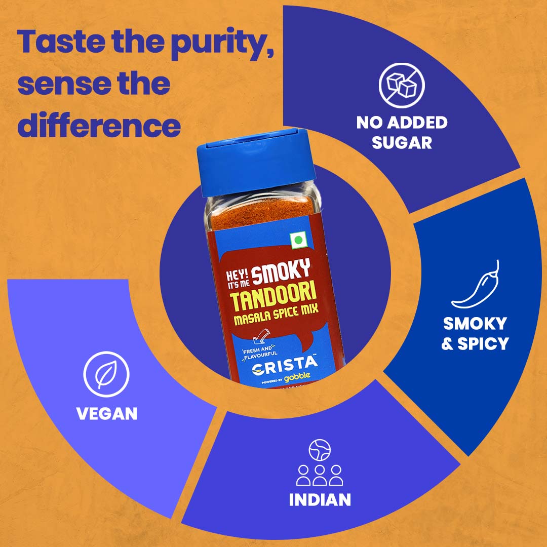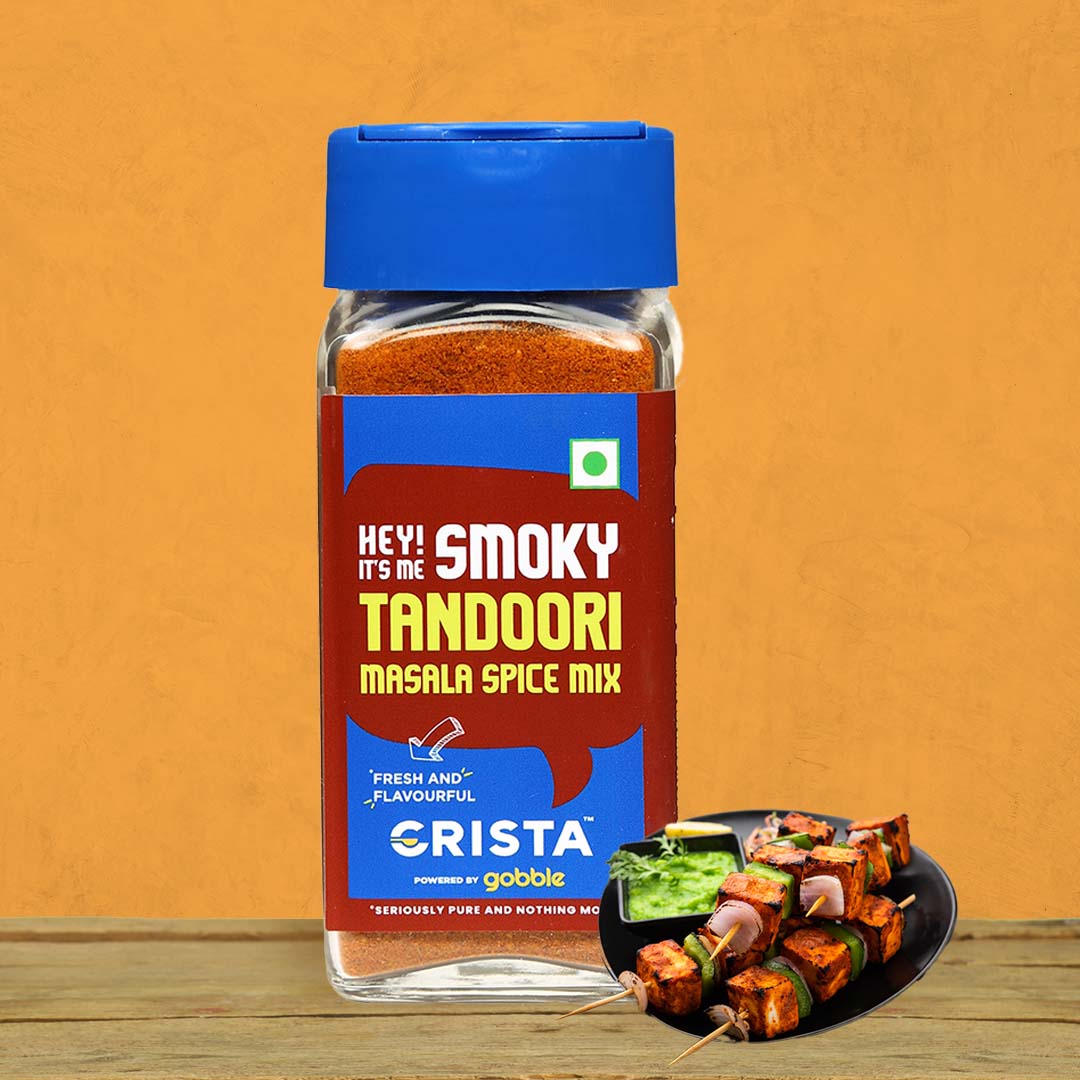 Hey! Its me Smoky Tandoori Masala Spice Mix. CRISTA Tandoori Masala Spice Mix is must have proprietary spice blend of coarse, whole and ground premiumgrade spices. This kitchen essential blend of spices adds a smoky flavour to Indian recipes that hero around chicken, prawn, paneer, babycorn, mushroom, potato and even tofu preparations. Freshly machine ground using our sophisticated hammer crushers and micro pulverisers, the blend is mixed in an automatic GMP blender to achieve the desired balance and consistency.