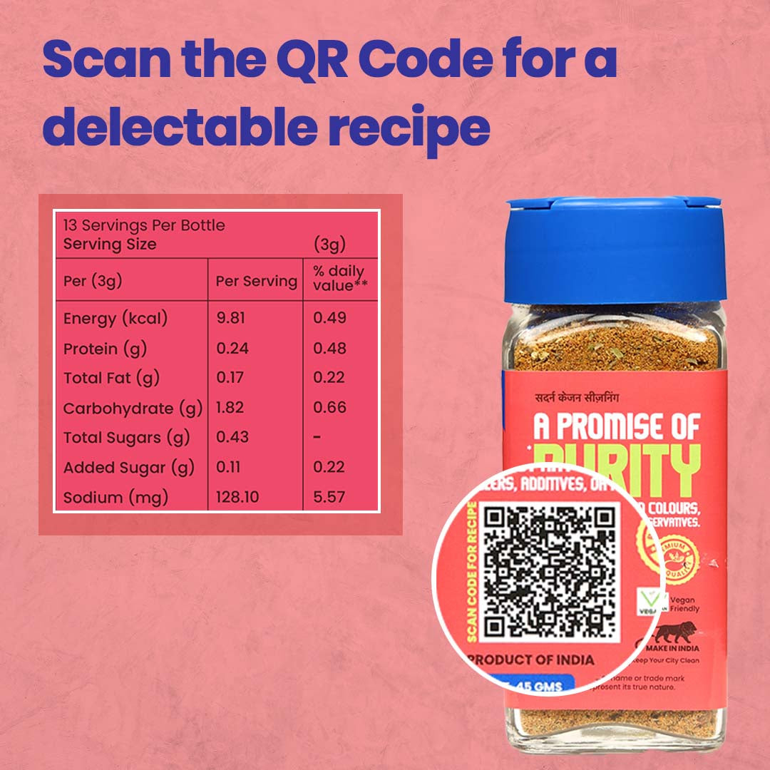 Hey! Its me Southern Cajun Seasoning. This complex and popular blend adds a burst of smoky, garlicky and peppery flavour. With a dash of heat, this seasoning has its origins in Southern America and is a great way to flavour veggies, meats, soups, fish and salads. The versatile and multipurpose flavour profile has made this seasoning popular in a variety of cuisines and is a cult favourite with Gen Z and millennials in India. Freshly machine ground using our sophisticated hammer crushers and micro pulverisers, the blend is mixed in an automatic GMP blender to achieve the desired balance and consistency. Scan the QR code on the bottle for a lip smacking recipe.