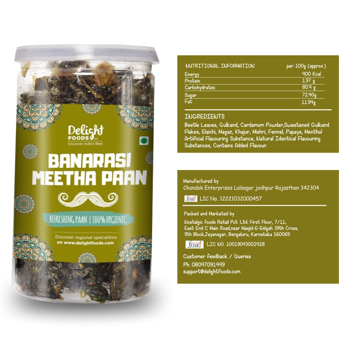 - Quantity: 100 Gm; Ingredient Type: Vegetarian; Package Content: 1 Meetha Paan (Without Supari & Areca Nut)