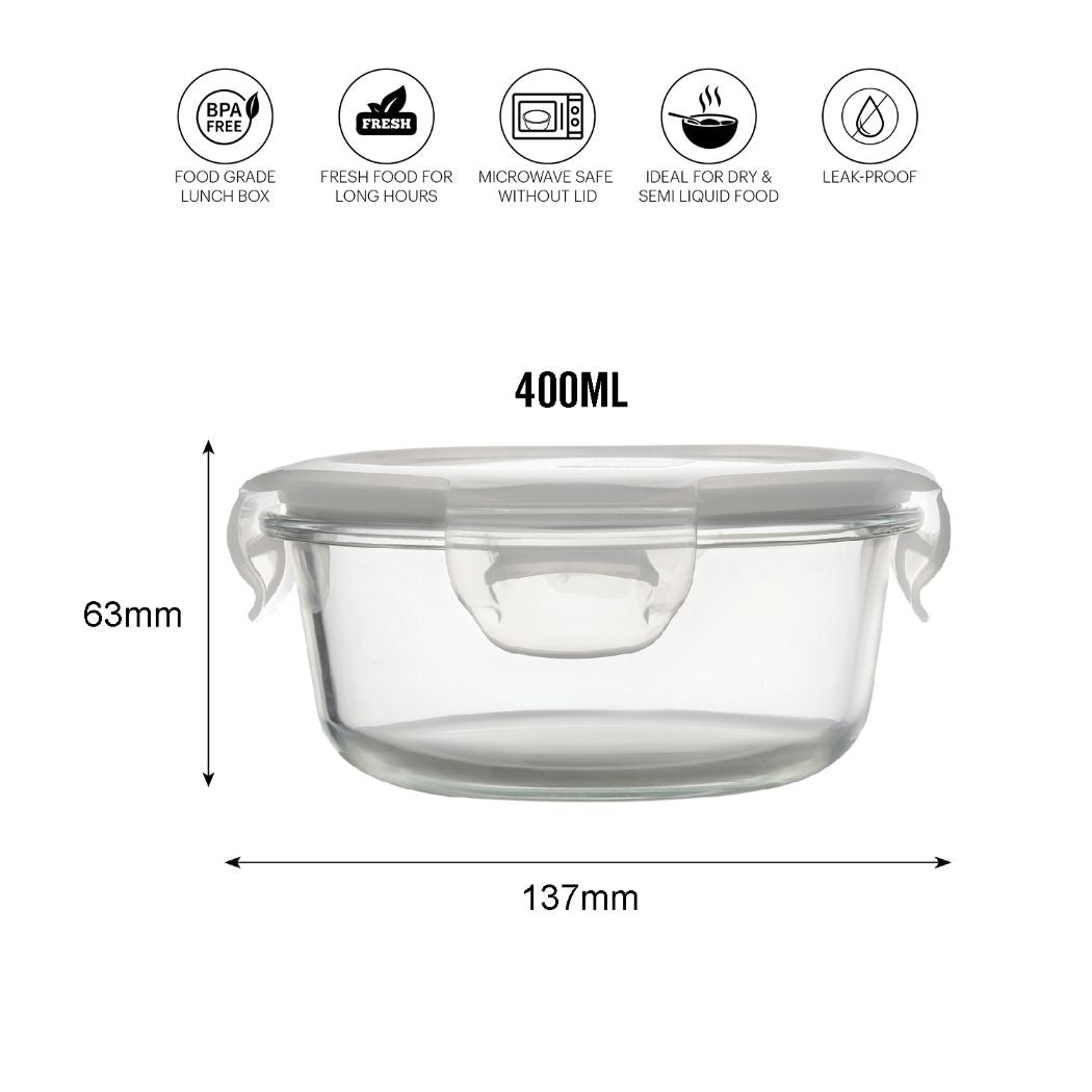 - Delighta Borosilicate Glass Lunch Box with Jacket, Round – Clear, available in 3-piece and 2-piece sets, each with 400 ml borosilicate glass containers.
