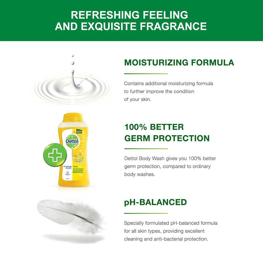 Dettol Fresh Bodywash provides Dettol’s trusted germ protection from a wide range of unseen germs. It cleanses and protects your skin keeping you healthy everyday. Dettol bodywash not only cleanses but conditions the skin without leaving it dehydrated. Dettol bodywash is recommended by the Indian Medical Association and is dermatologically tested to give 100% better protection compared to ordinary soaps. Its rich lather is specially formulated to protect from a wide range of unseen germs and diseases.