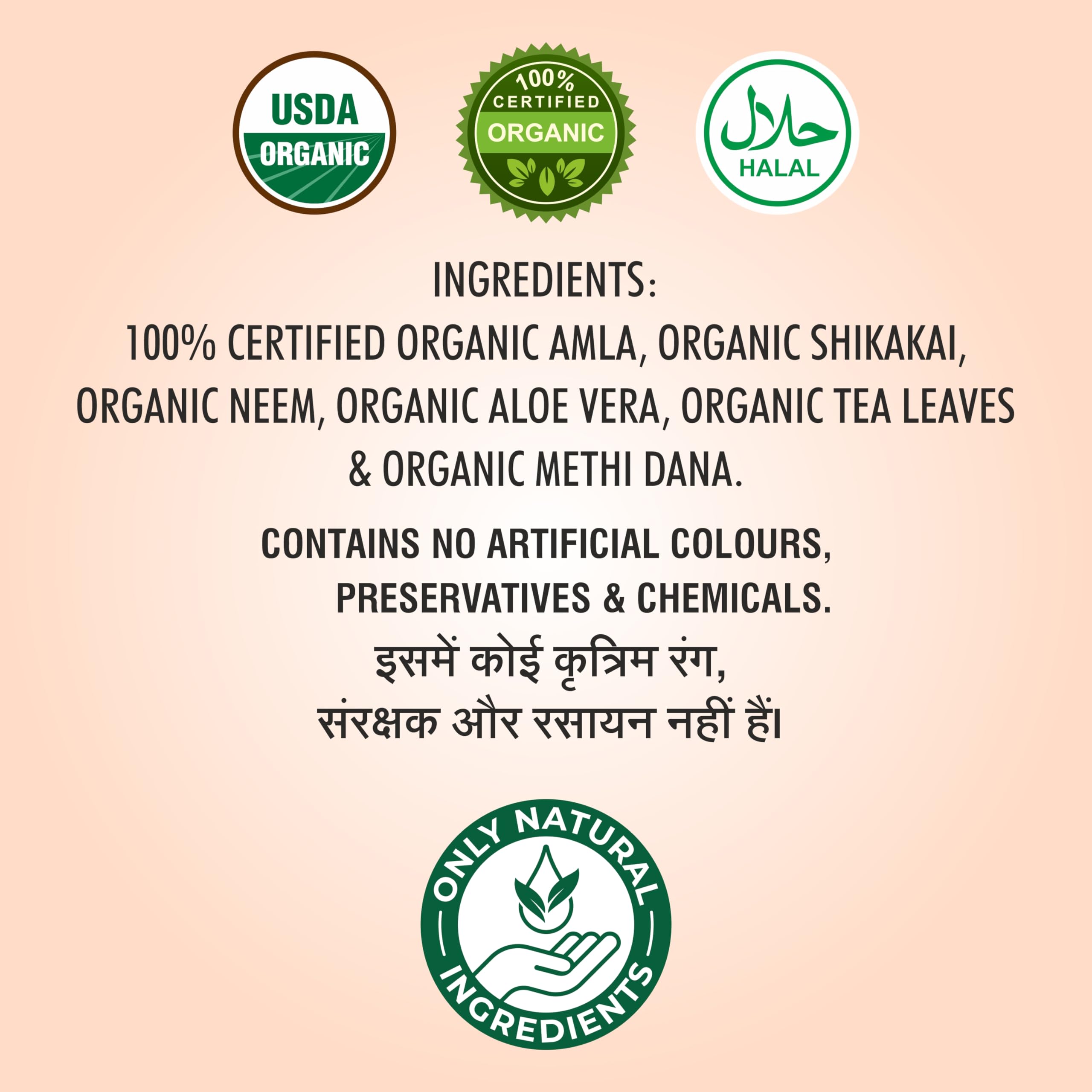 - Consists of 6 key ingredients: Aloe Vera, Amla, Methi, Neem, Shikakai, Green Tea.Shikakai has low pH levels and its mild nature suits even those people having a sensitive scalp, It does not make the scalp dry