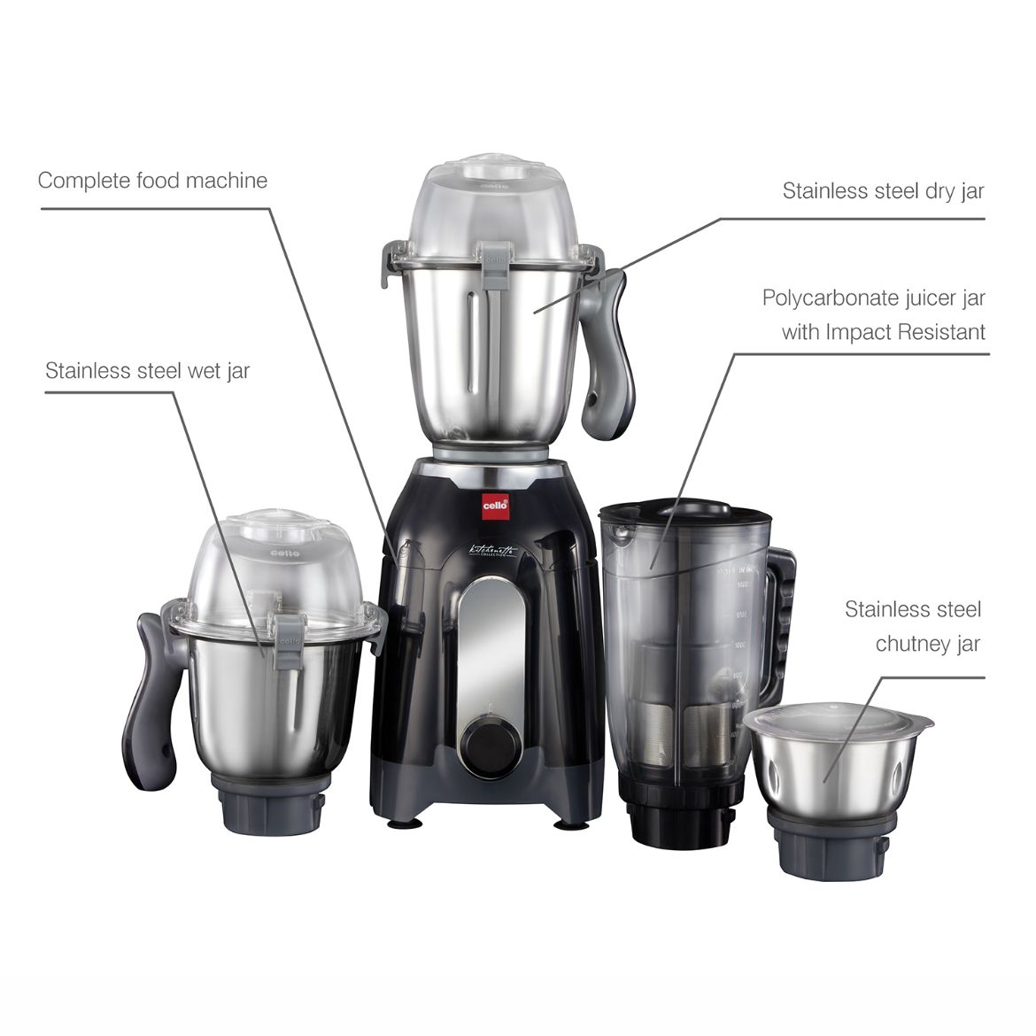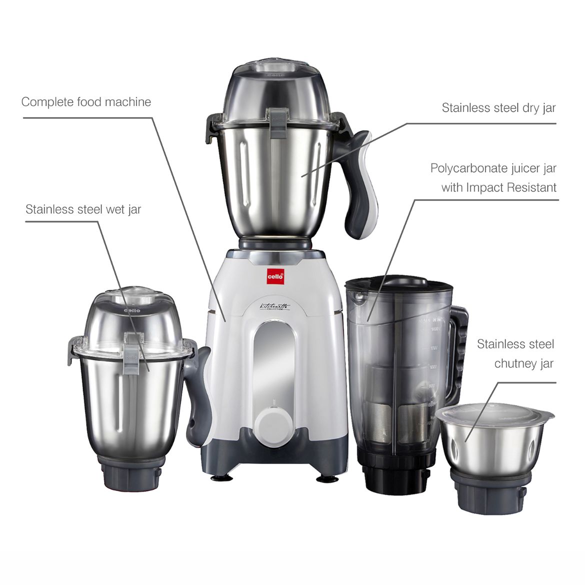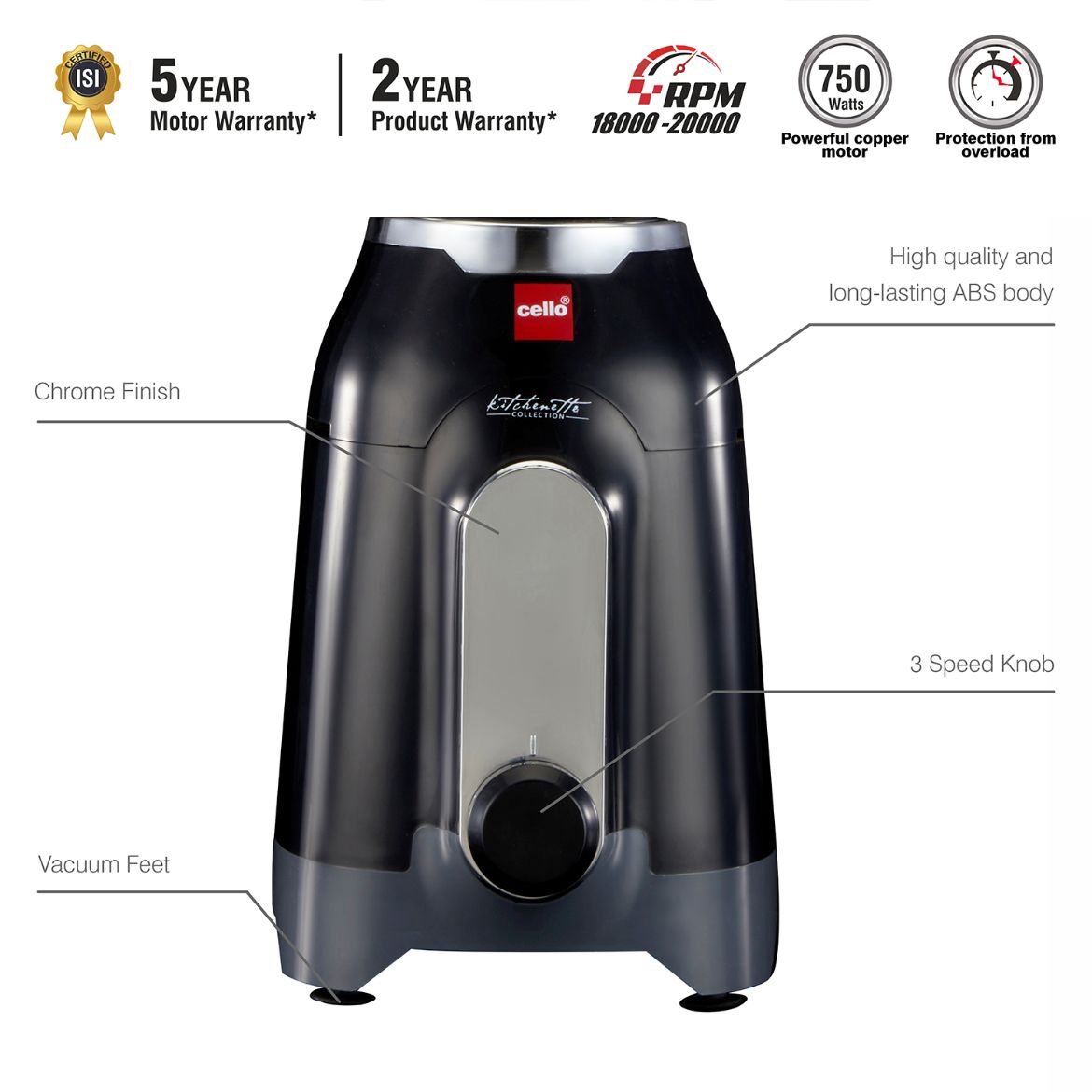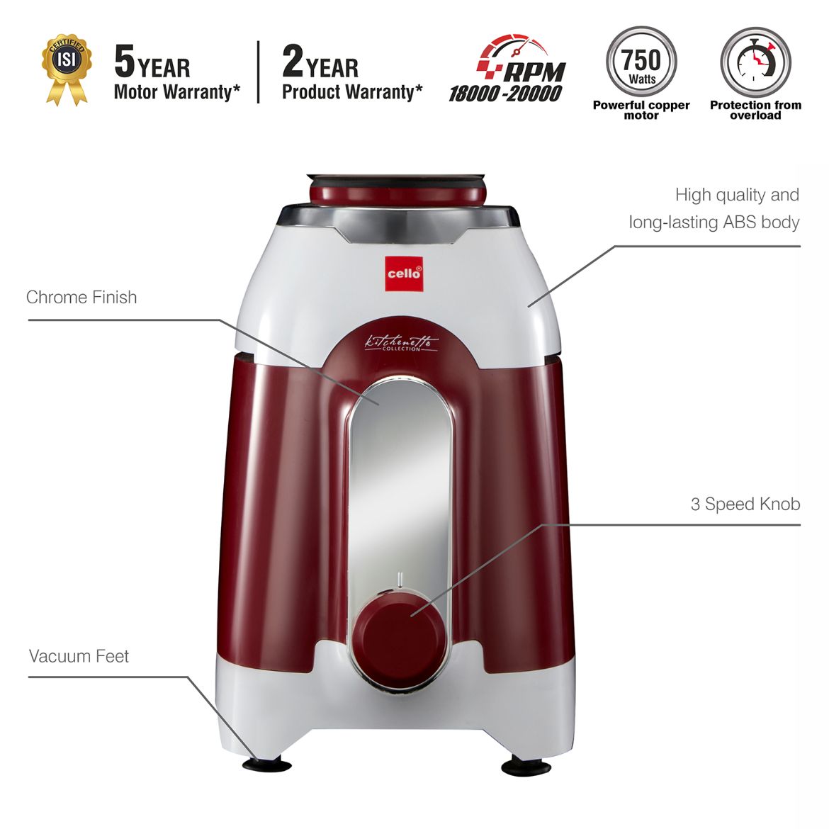 - High-Performance Appliance: The Cello Discovery Chef Juicer Mixer Grinder is equipped with a powerful 750W copper motor, ensuring superior grinding performance for all your kitchen needs.
