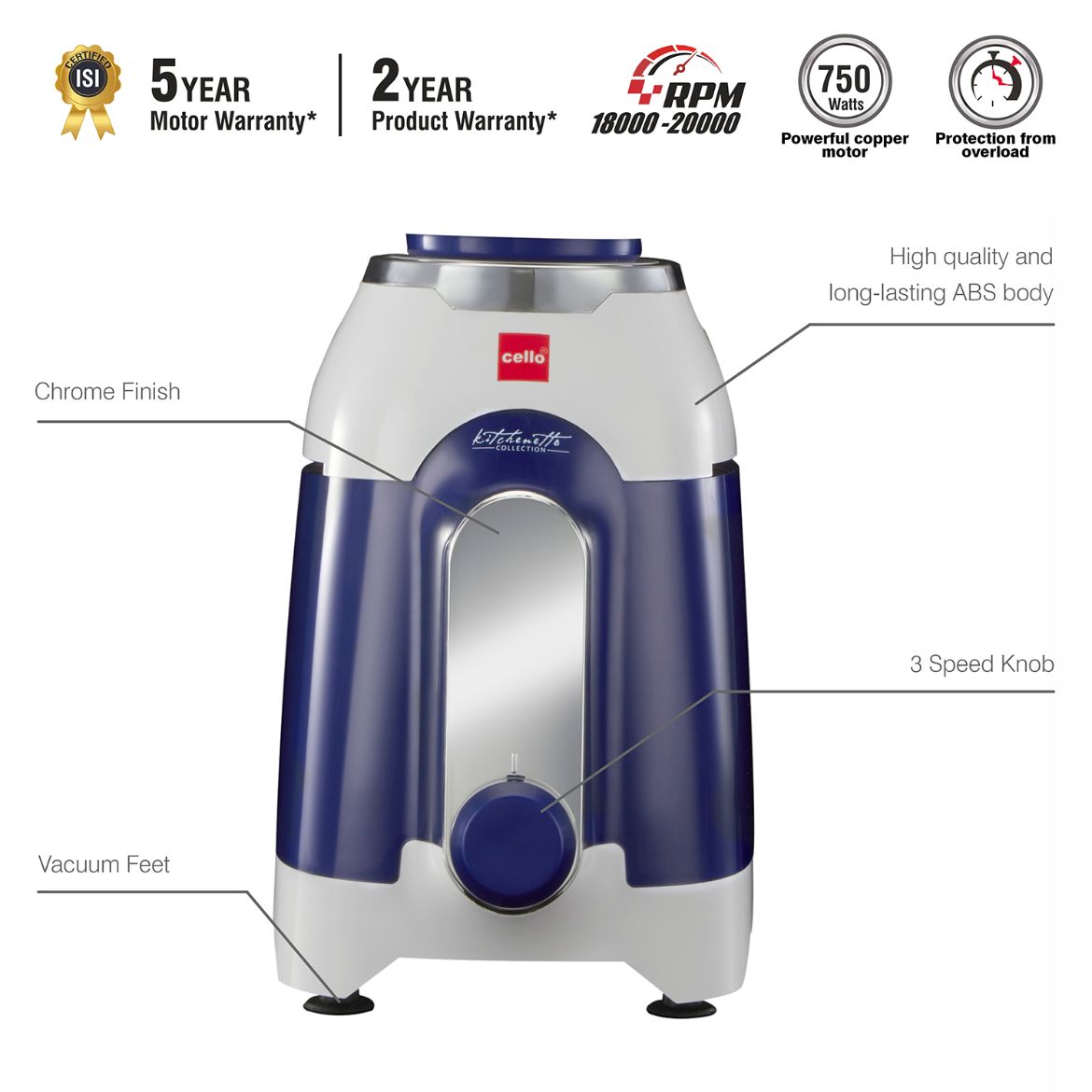Introducing the Cello Discovery Chef Juicer Mixer Grinder – a compact marvel designed to elevate your modern kitchen experience. Crafted with 304 food-grade material for utmost safety and hygiene, this appliance boasts a robust 750W copper motor that ensures high-performance grinding. Its impact-resistant stainless steel blade effortlessly handles a variety of textures, promising swift and efficient blending and grinding. Equipped with anti-skid legs, it stays firmly in place during operation. The 3-speed control knob offers precise control without overloading the system. With high-quality jars and durable ABS jar sockets, this mixer grinder guarantees longevity. The chrome finish body adds an elegant touch to your kitchen décor. Available in White, Blue, Maroon, and Black, the Discovery Chef Juicer Mixer Grinder includes 2 stainless steel jars, a juicer jar, and a chutney jar. Experience convenience, style, and efficiency like never before.