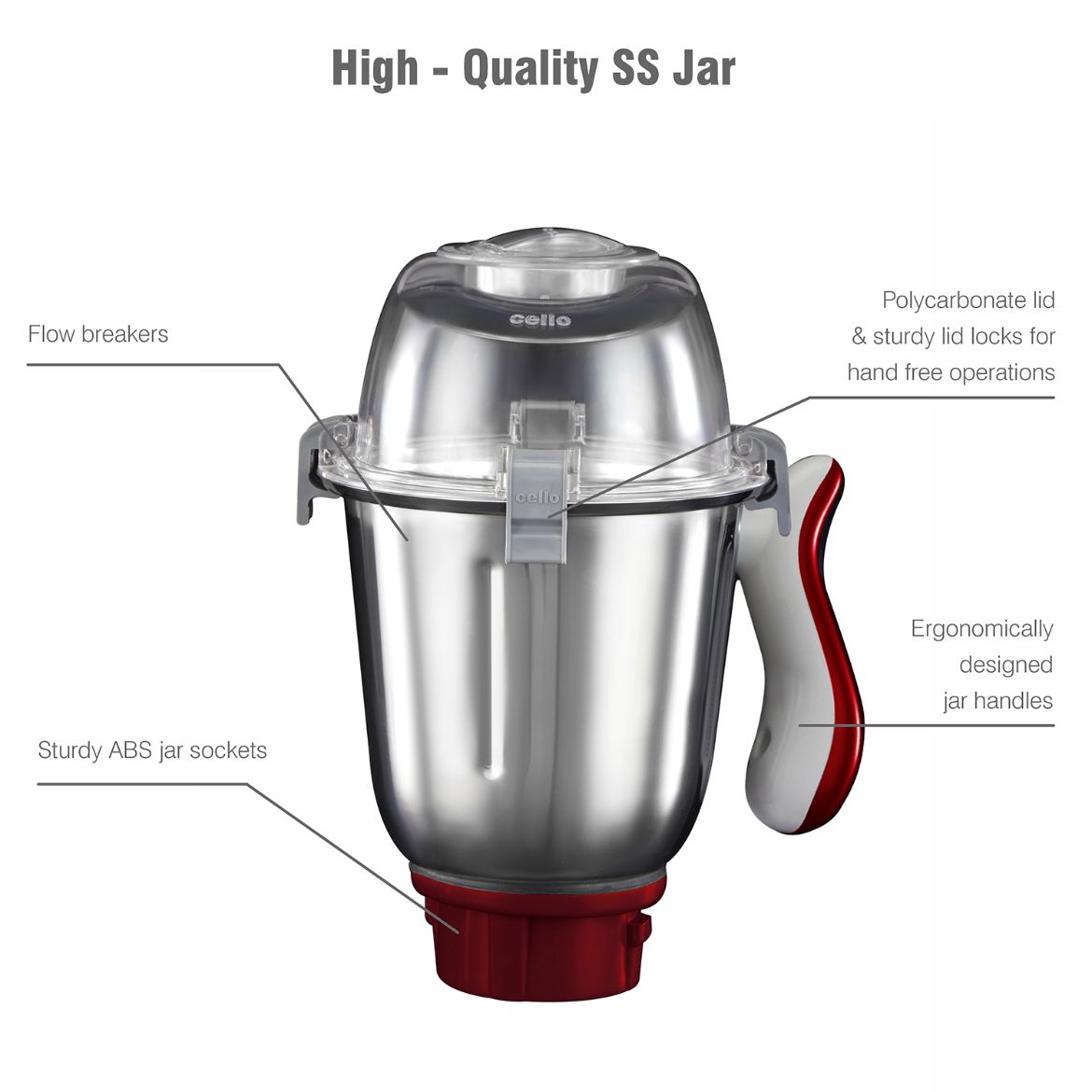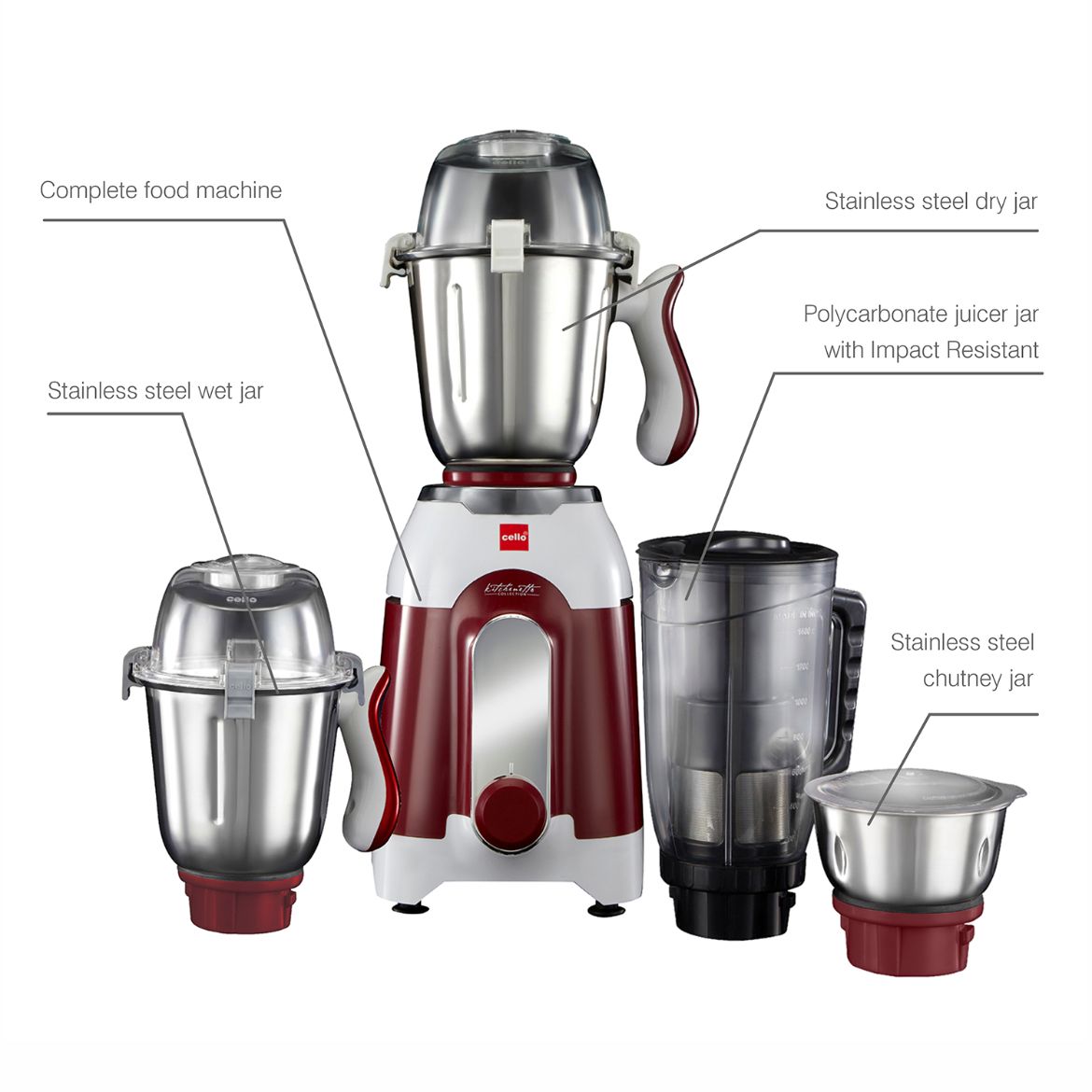 - Elegant and Functional: The mixer grinder features a chrome finish body that not only adds an elegant touch to your kitchen but also comes with sturdy lid locks for hands-free operation. It includes 2 stainless steel jars, a juicer jar, and a chutney jar, providing a comprehensive solution for all your food preparation needs. Available in White, Blue, Maroon, and Black, this appliance combines style and functionality seamlessly.