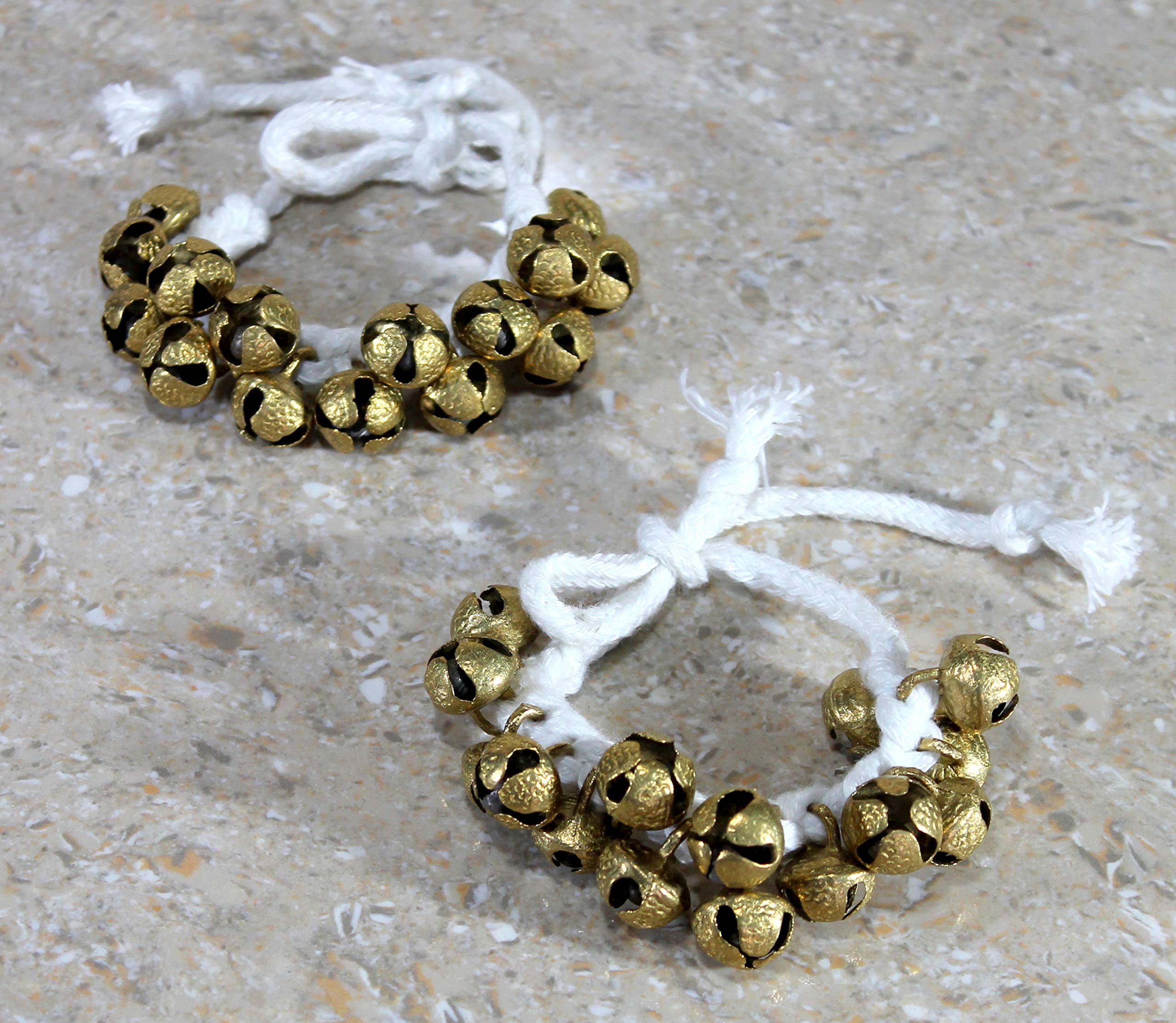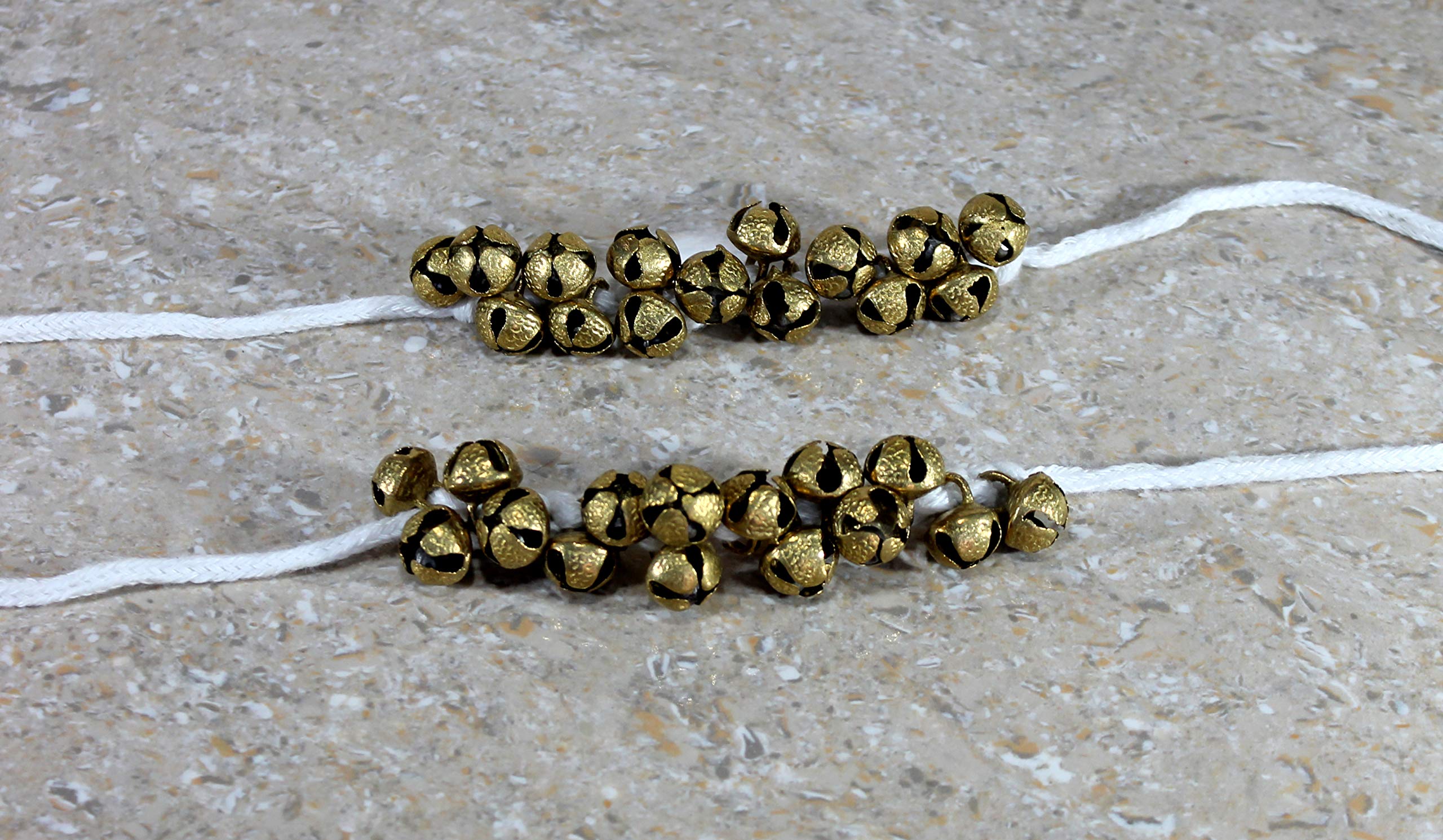 - Bells of brass tied with Cotton String. The Ghungroo are sewed/ stitched to the fabric.