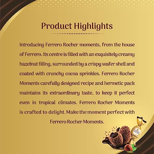 - Ferrero Rocher Moments’ carefully designed recipe and hermetic pack maintain its extraordinary taste, to keep it perfect even in tropical climates