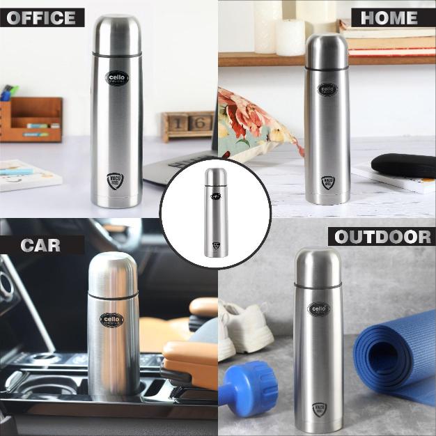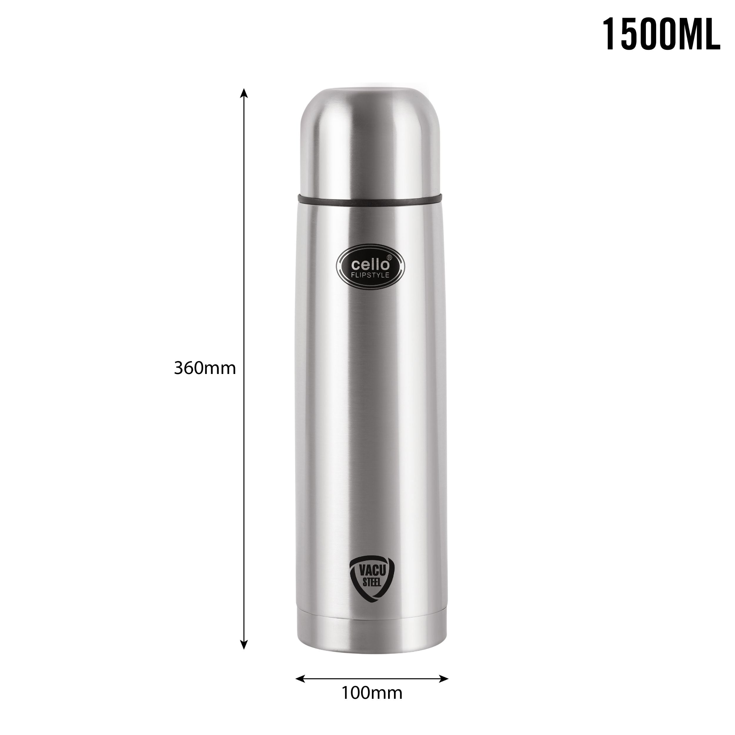 - The Flipstyle Flask with Thermal Jacket in Silver is a 1500ml Vacusteel Water Bottle by Cello, offering superior insulation for hot and cold beverages.