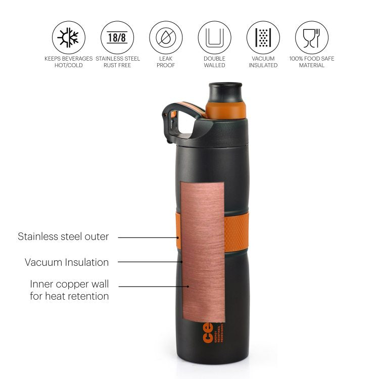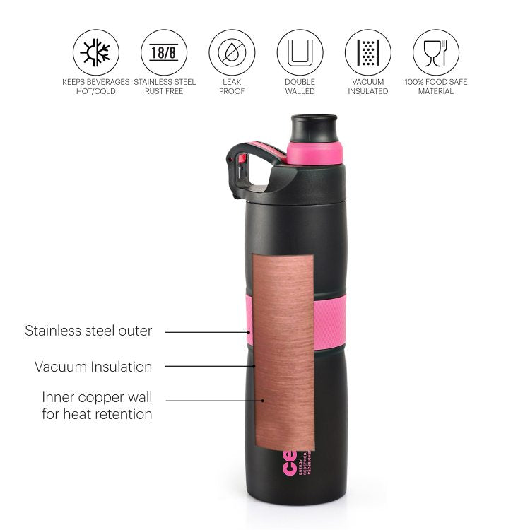 - Insulation Type: Cello Force water Flask features double walled vacuum insulation with an inner copper coating that retains the temperature, keeping beverages hot or cold for a prolonged period.