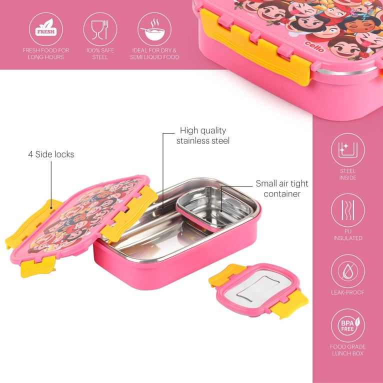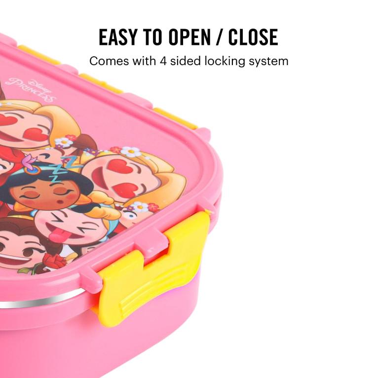 Introducing the fun food insulated lunch box from Cello Kidzbee, a lunchtime companion that’s perfect for kids! This big-sized lunch box features delightful Emoji style Disney Princess, Spiderman and Tinker Bell prints that kids will adore. Crafted with care, its inner compartment is made of sturdy stainless steel, while the outer layer is BPA-free plastic. Designed in charming colours, it’s easy to carry, fitting effortlessly into backpacks. The lunch box comes with secure side locks and an airtight lid, keeping meals fresh and mess-free. Inside, a leakproof steel container awaits, ready to hold savory gravies and tasty curries. Ideal for school, picnics, and adventures, it’s both safe and fun!