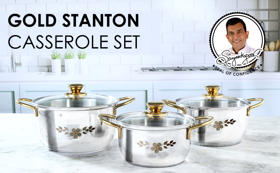 - VERSATILE AND DURABLE: The Wonderchef Gold Stanton Casserole Set is suitable for gas stoves, induction cooktops, hot plates, and ceramic plates, making it versatile for all your cooking needs. Built to last, these casseroles are designed for everyday use.