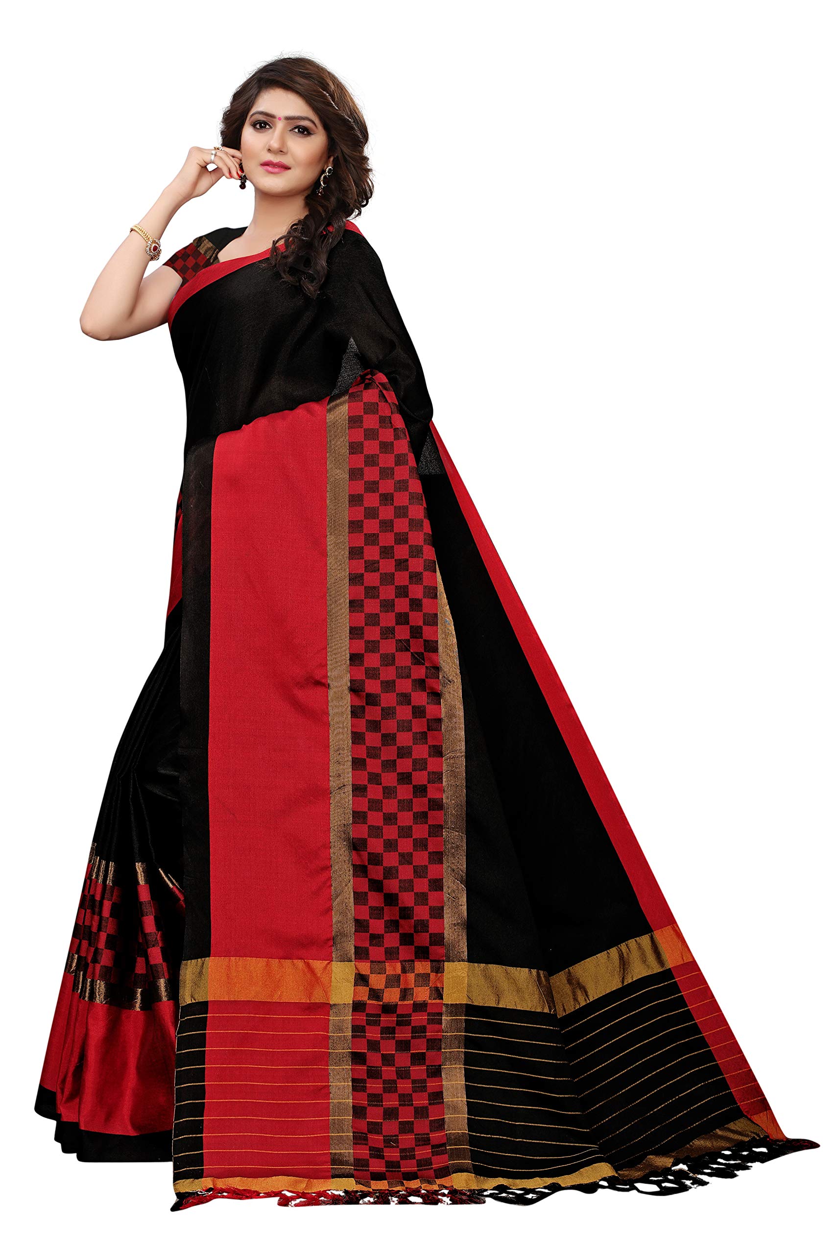 Indira Designer women’s Black color cotton silk blend zari work saree border tassels with blouse piece (box-arpan-black_free size). saree fabric: Cotton silk blend, saree color: Black. Saree length:-5.5 mtr, blouse length:-0.80 mtr.